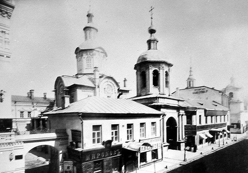 Там, где теперь закрытый переход от Никольской улицы к метро, располагался монастырский сад. Здесь был монастырский театр, где силами студентов академии разыгрывались пьесы. От улицы монастырь был отгорожен двумя корпусами с лавками. В конце XIX века их сломали и на их месте построили другие в «русском стиле». Левый дом – номер 7 – 1895‑1897 годов построен по проекту архитектора М. Преображенского, а общеее руководство строительством осуществлял архитектор С.У. Соловьев. Правый с колокольней и воротами построен в 1899‑1900 годах архитектором З.И. Ивановым. Колокольня 1900 года повторяла колокольню церкви Успения на Покровке. В этом корпусе до 1917 года находился большой книжный магазин И.Д. Сытина.