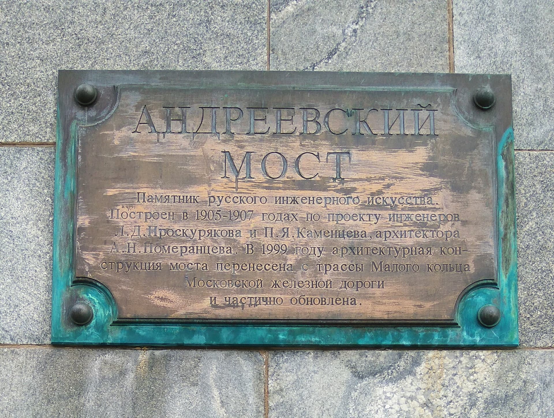 Андреевский мост был построен в 1905-1907 годах по проекту инженеров Л. Д. Проскурякова, П. Я. Каменцева и архитектора А. Н. Померанцева между станциями Канатчиково и Воробьевы горы Малого кольца Московской окружной железной дороги. При строительстве мост носил имя Сергиевский в память о московском генерал-губернаторе Великом князе Сергее Александровиче, убитом террористом Иваном Каляевым в Кремле 4 февраля 1905 года.