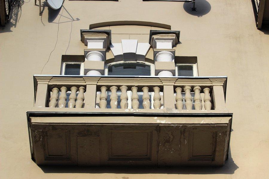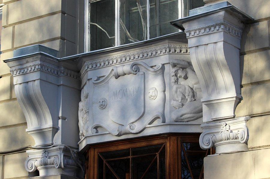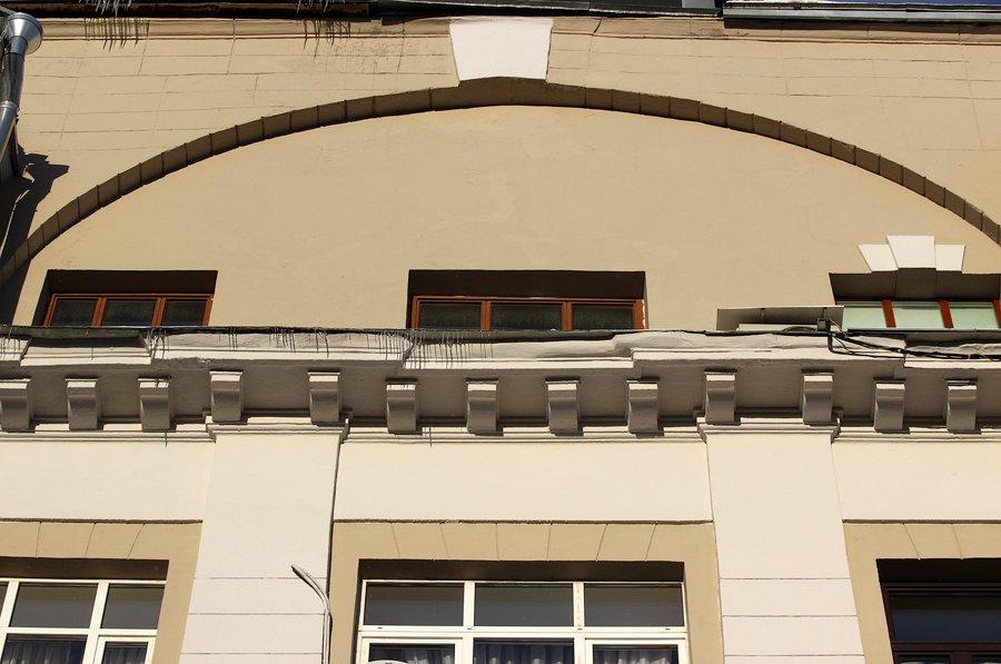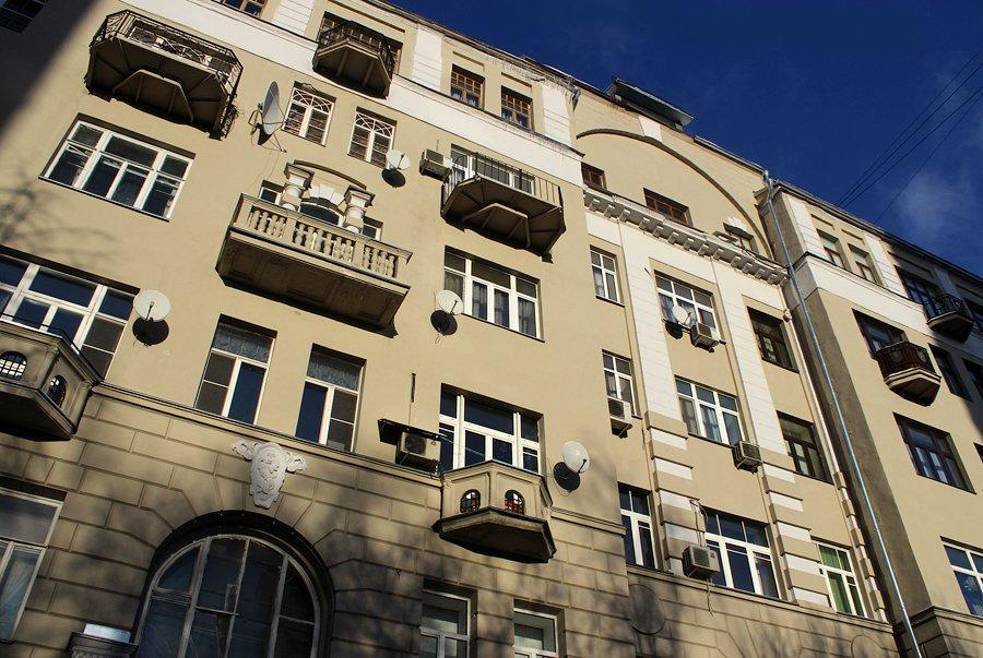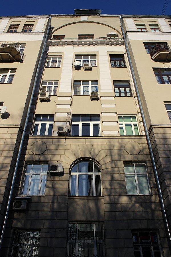 Новый красивый дом огромен и массивен, как почти все многоквартирные архитектурные здания, сооруженные И. Г. Кондратенко в 1910 гг. Два нижних этажа рустованы. Эффектно выделены входы в здание, решенные как трехгранные эркеры, поверхности которых остеклены зеркальными стеклами, составляющими четкий геометрический рисунок. Центральная часть фасада увенчана гигантским прямоугольным аттиком с плоской полуциркульной нишей. Разномастные балкончики украшают фасад со стороны Гагаринского и Староконюшенного переулков. Над подъездами можно увидеть год постройки римскими цифрами MCMXIV (1914).