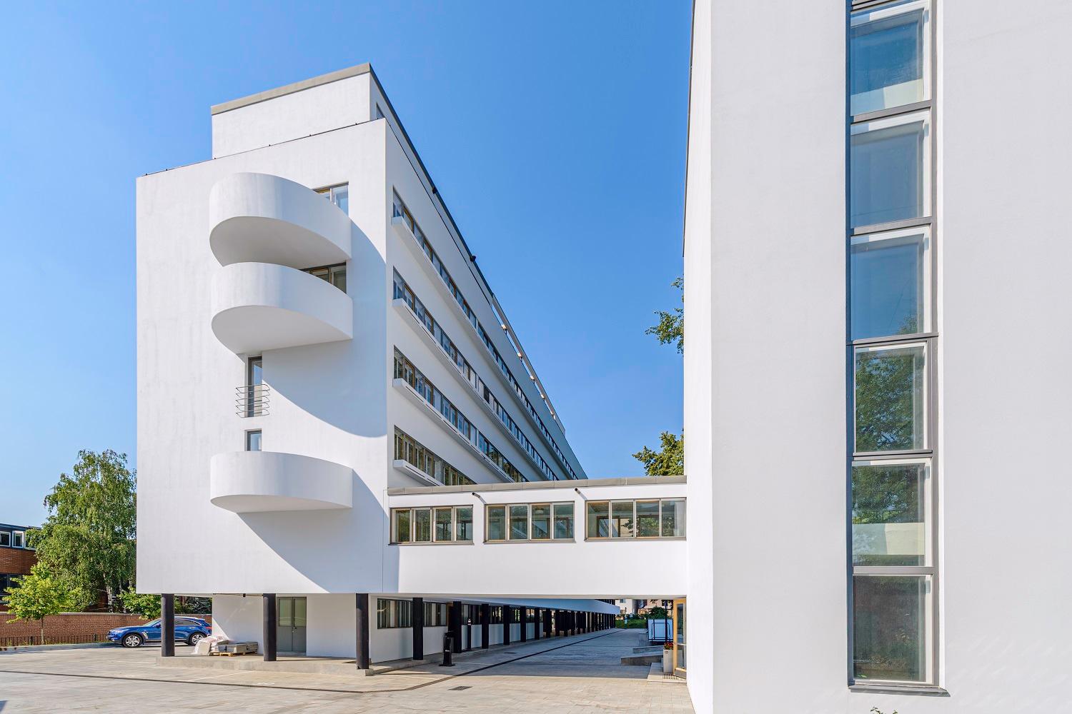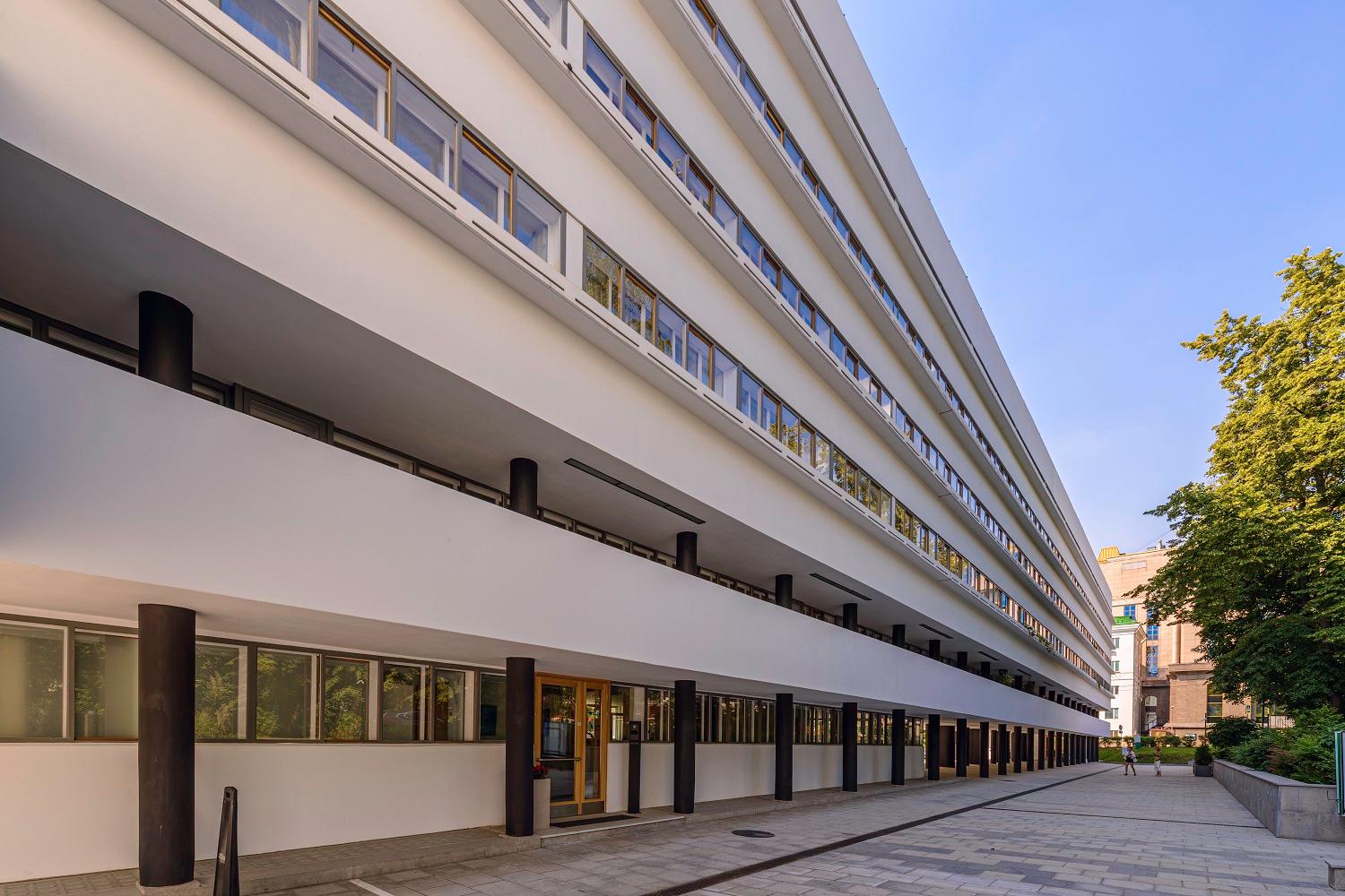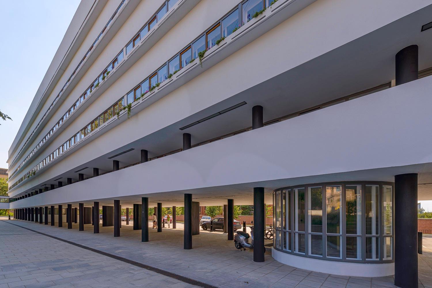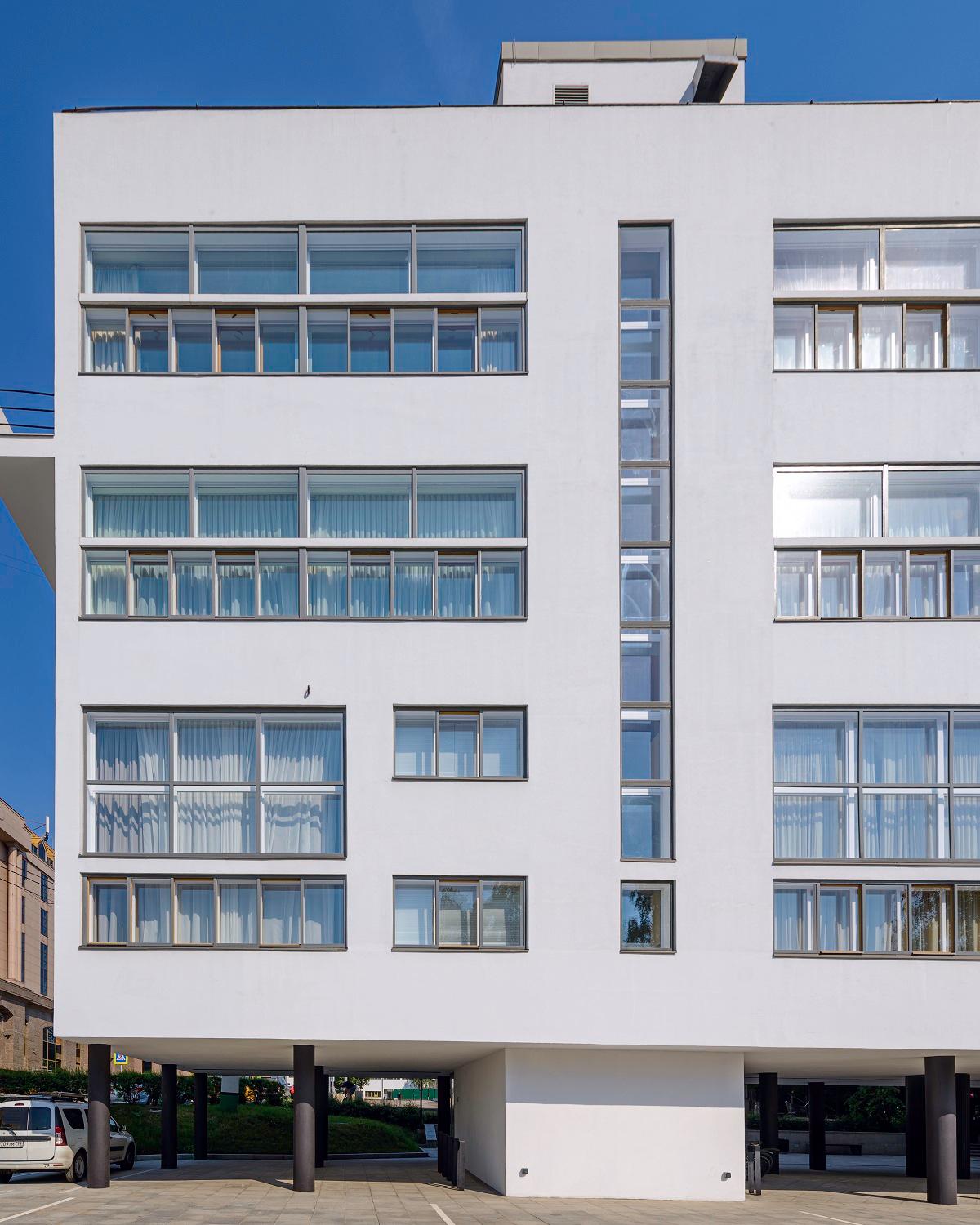 В ходе реставрационных работ были решены многочисленные сложные задачи. Начали с восстановления исторического облика фасадов. Тщательные исследования позволили определить оригинальный цвет здания — сложный оттенок белого, который был воссоздан с большой точностью. Особое внимание уделили реставрации оконных конструкций. Уникальная система сдвижных ленточных окон была воссоздана с использованием современных технологий, но с сохранением исторического облика.