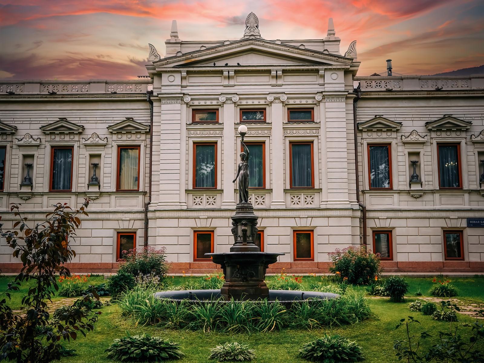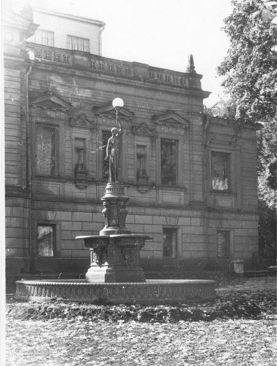 На лужайке перед домом находится действующий до сих пор фонтан «Богиня ночи» с чугунной женской фигурой, держащей в руке электрический фонарь, изготовленный в парижской мастерской в конце XIX века. В Париже были изготовлены и светильники, расположенные в нишах второго этажа главного фасада, и скульптура «Богиня плодородия» перед окном зимнего сада.