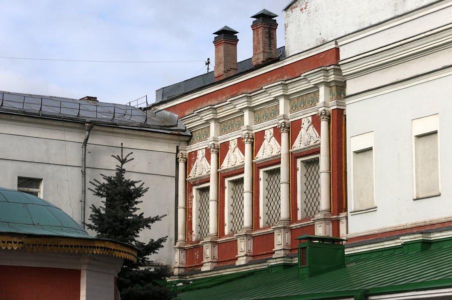 Brick Chambers built in 1697 is the oldest building in the complex. It is located deep in the backyard in perpendicular to Nicholskaya street. Chambers go out with its side, where a fragment tiled decor is visible behind the Kazan Cathedral. Precious metals were stored in the basement of the building, forge, smelting, wages and other production facilities were on the ground floor, Assay, treasury and pantry were on the top floor of the building. Upper floor facades were decorated with carved white stone architraves semi columns and polychrome tiles. Mint operated until 1797, there were minted gold, silver and copper coins.