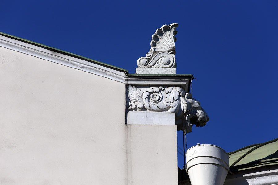 Ампирные формы особняка доведены почти до гротеска. Карниз почти не проработан, кроме тонкого пояска иоников, массивный антаблемент напоминает архитектуру архаики, энтазис (утолщение ствола колонны) утрирован и приземистые колонны похожи на бочки.