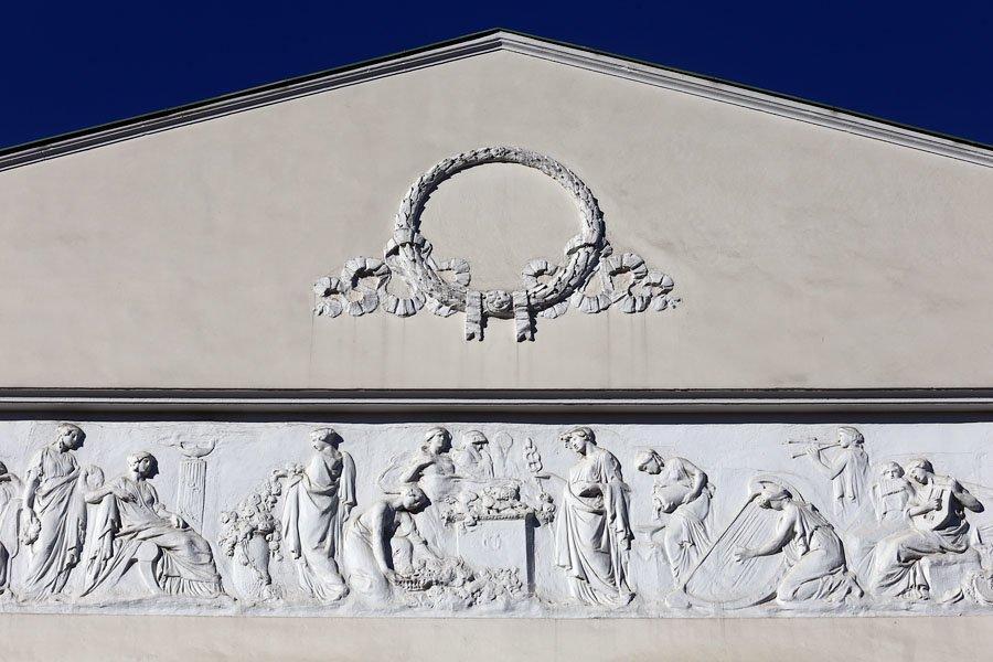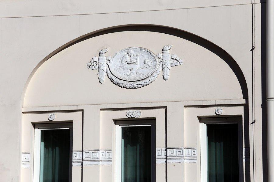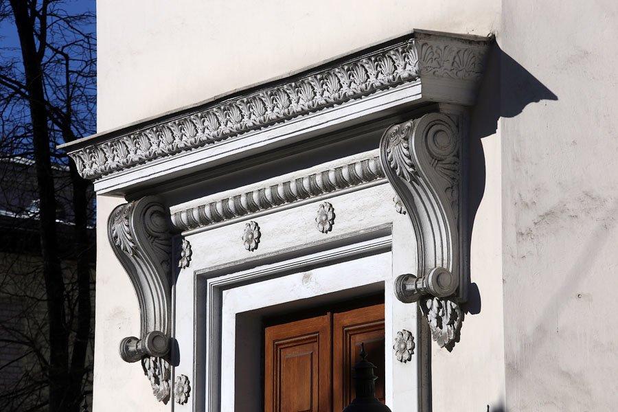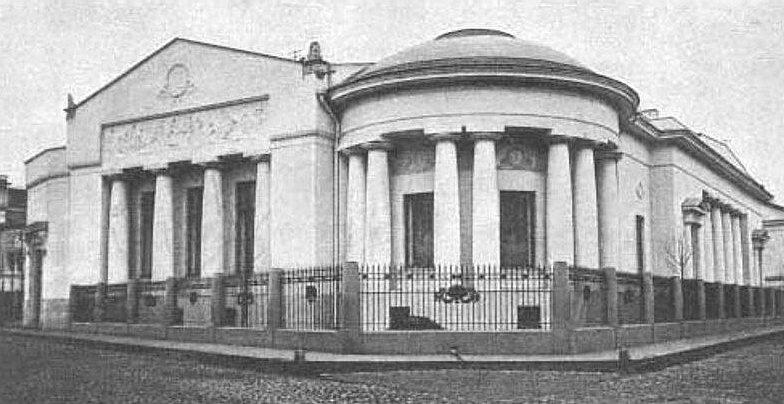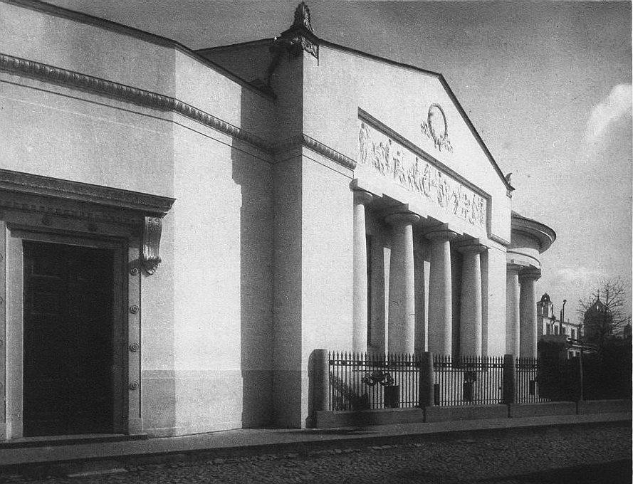 Упрощённые колонны с квадратными плитами капителей и поясками иоников напоминают ордер послепожарной Москвы, а сдвоенные колонны, их массивность и лаконичное использование деталей предвосхищают «пролетарскую классику» И. А. Фомина.