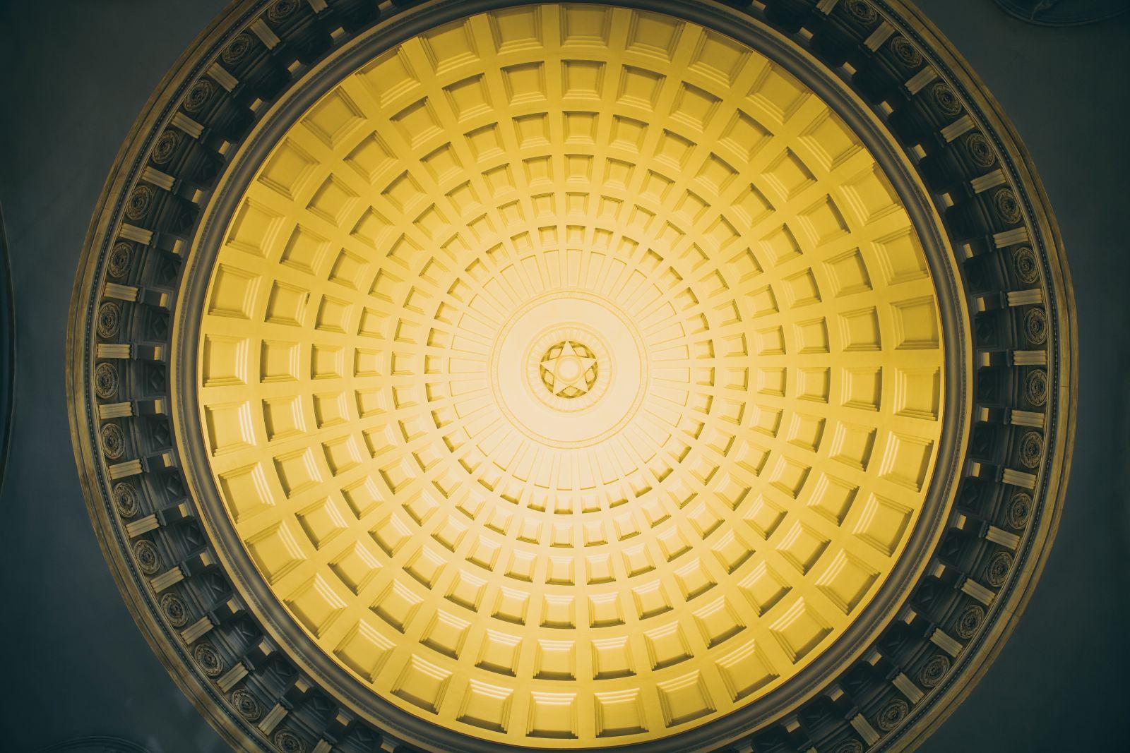 Свод центрального зала декорирован лепными розетками и шнурами, рисунок которых взят из кельтских узоров.