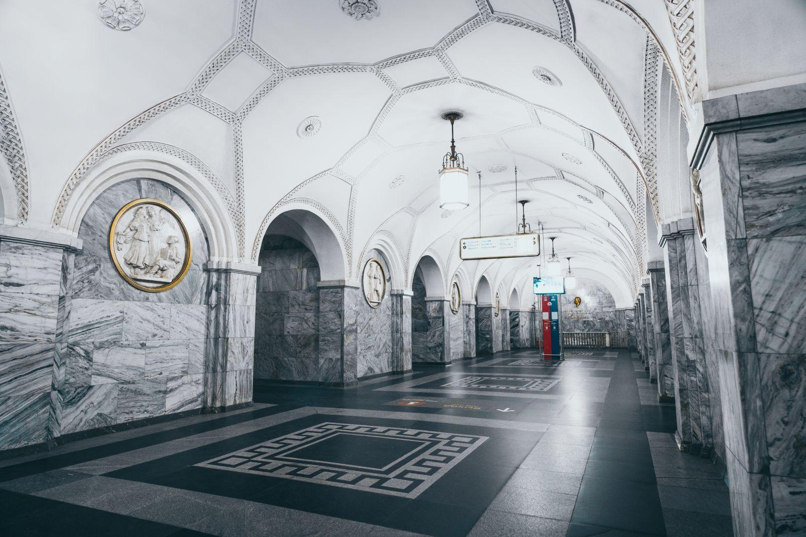 Critics point out that greater visual lightness and airiness could be achieved by using lighter colored finishing material of pylons instead of gray “Lopota” marble. I.E. Rozhin considered the choice of hanging lamps placement to be his mistake. They were between the medallions with reliefs and not in front of them which resulted in a double shadow drop. This fact was an unpleasant surprise for the architect and nearly drove the sculptor into tears, however the station was completed by that time and it was not possible to make changes.