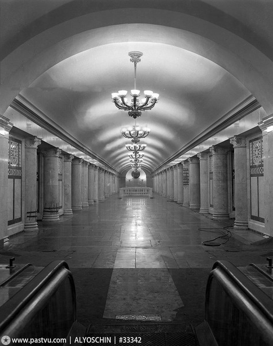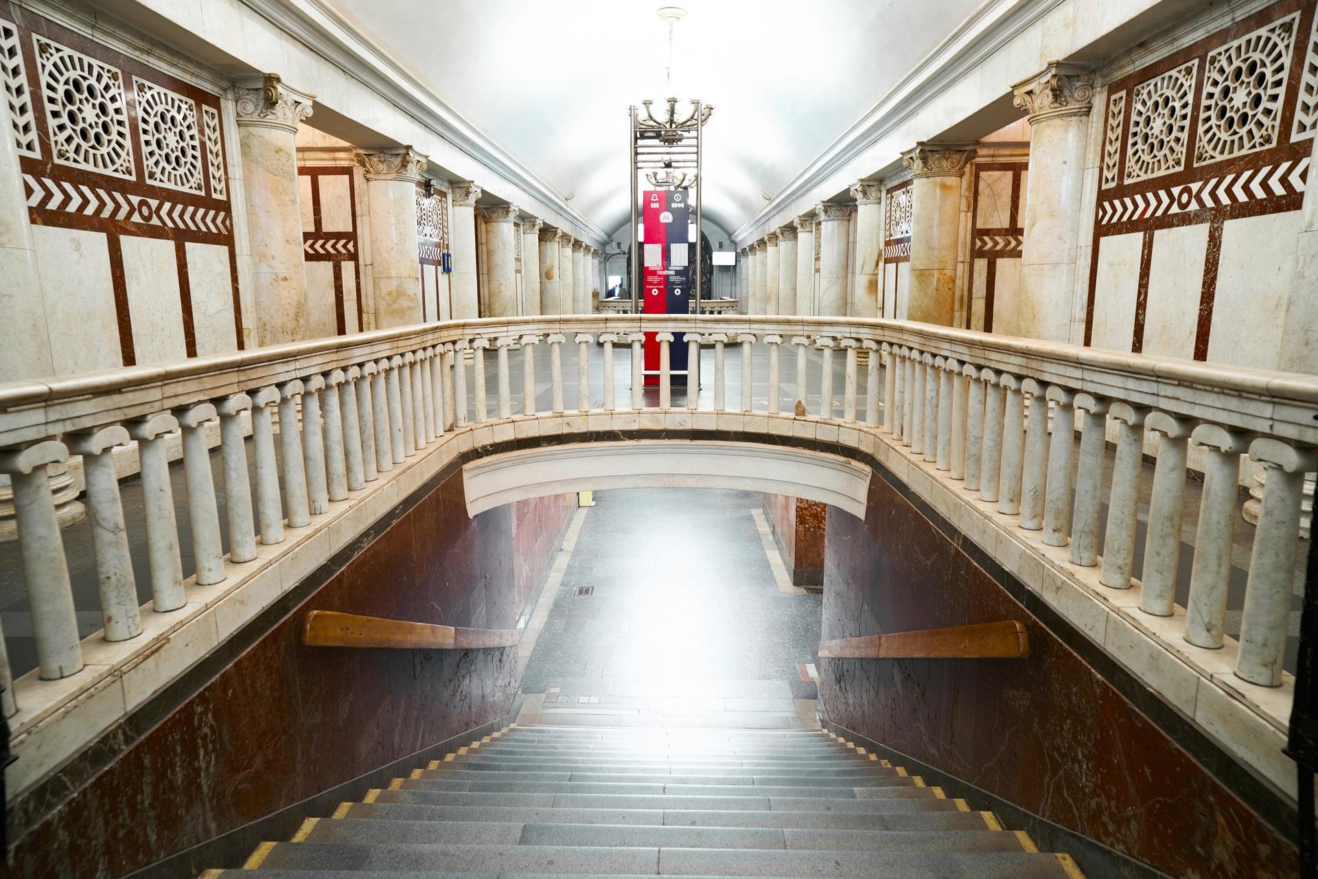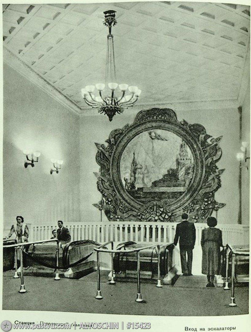 На тупиковой стене размещена мозаика «Рабочий и колхозницы» художника П.Д. Корина. Ранее на месте этого панно находился медальон с изображением Ленина и Сталина скульптора М.Г. Манизера.