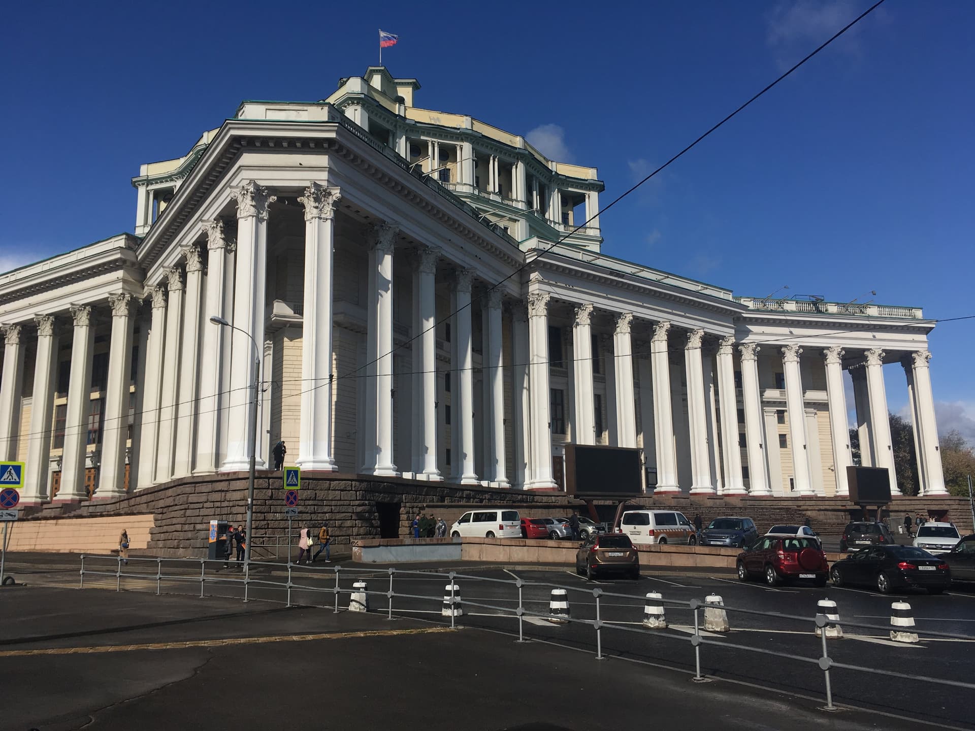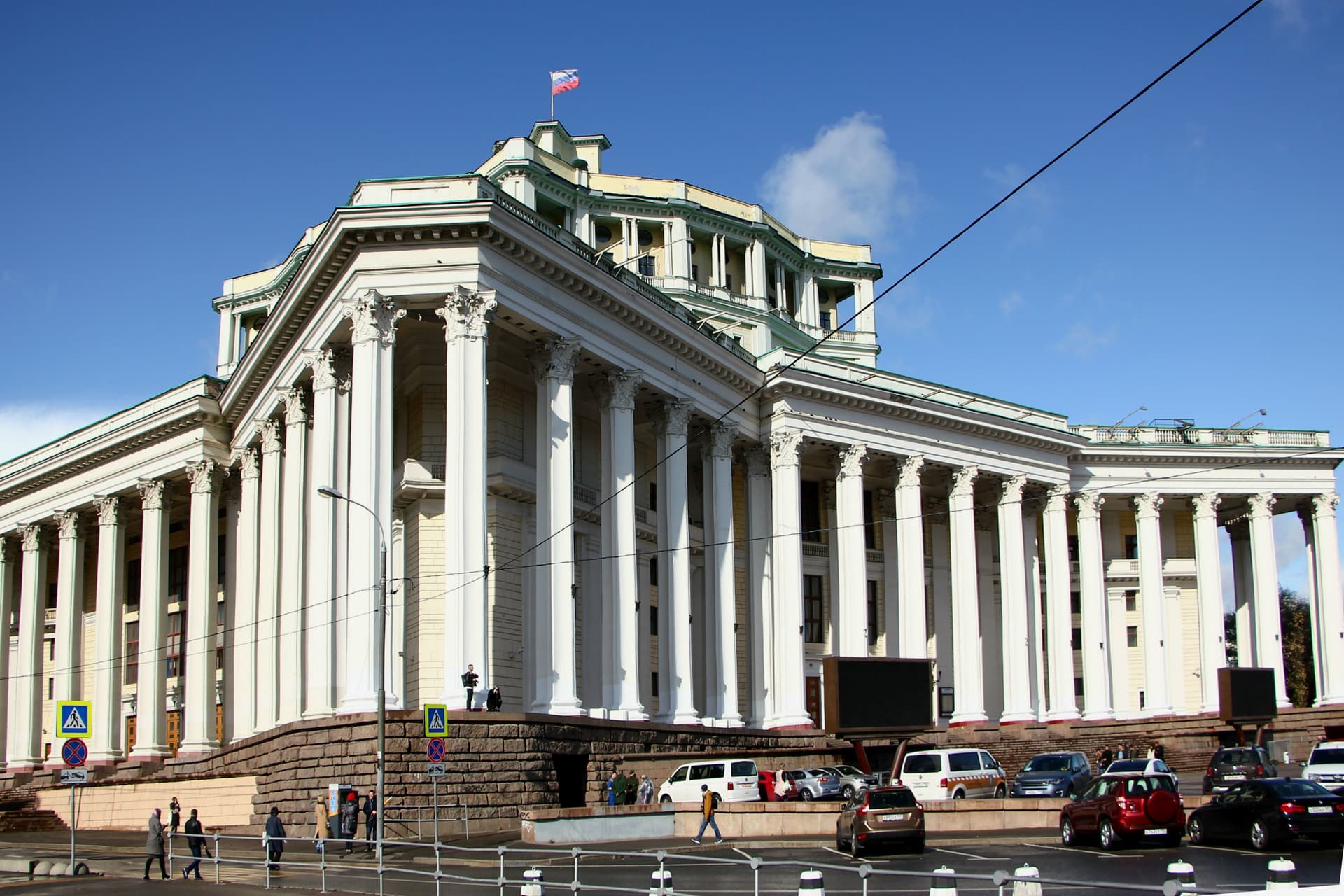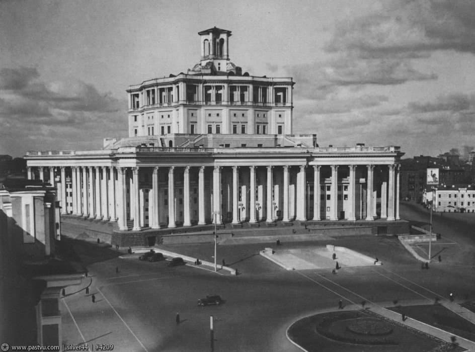 Здание театра – один из ярчайших примеров так называемого сталинского ампира, не имеющее себе аналогов, грандиозное по масштабам. В форме пятиконечной звезды здание было построено в 1934–40 гг. на Суворовской площади по проекту К.С. Алабяна и В.Н. Симбирцева (при участии Б.Г. Бархина).
