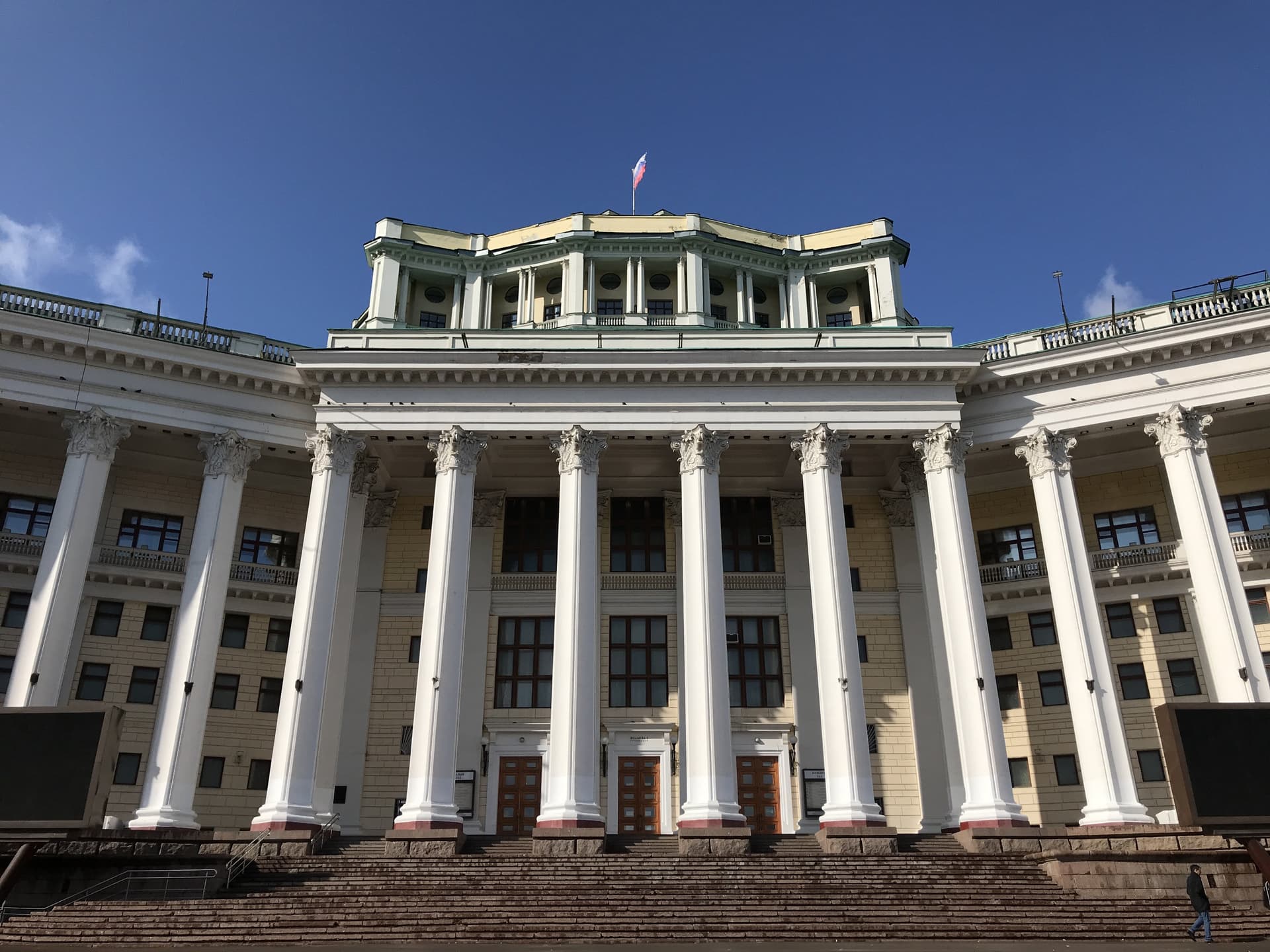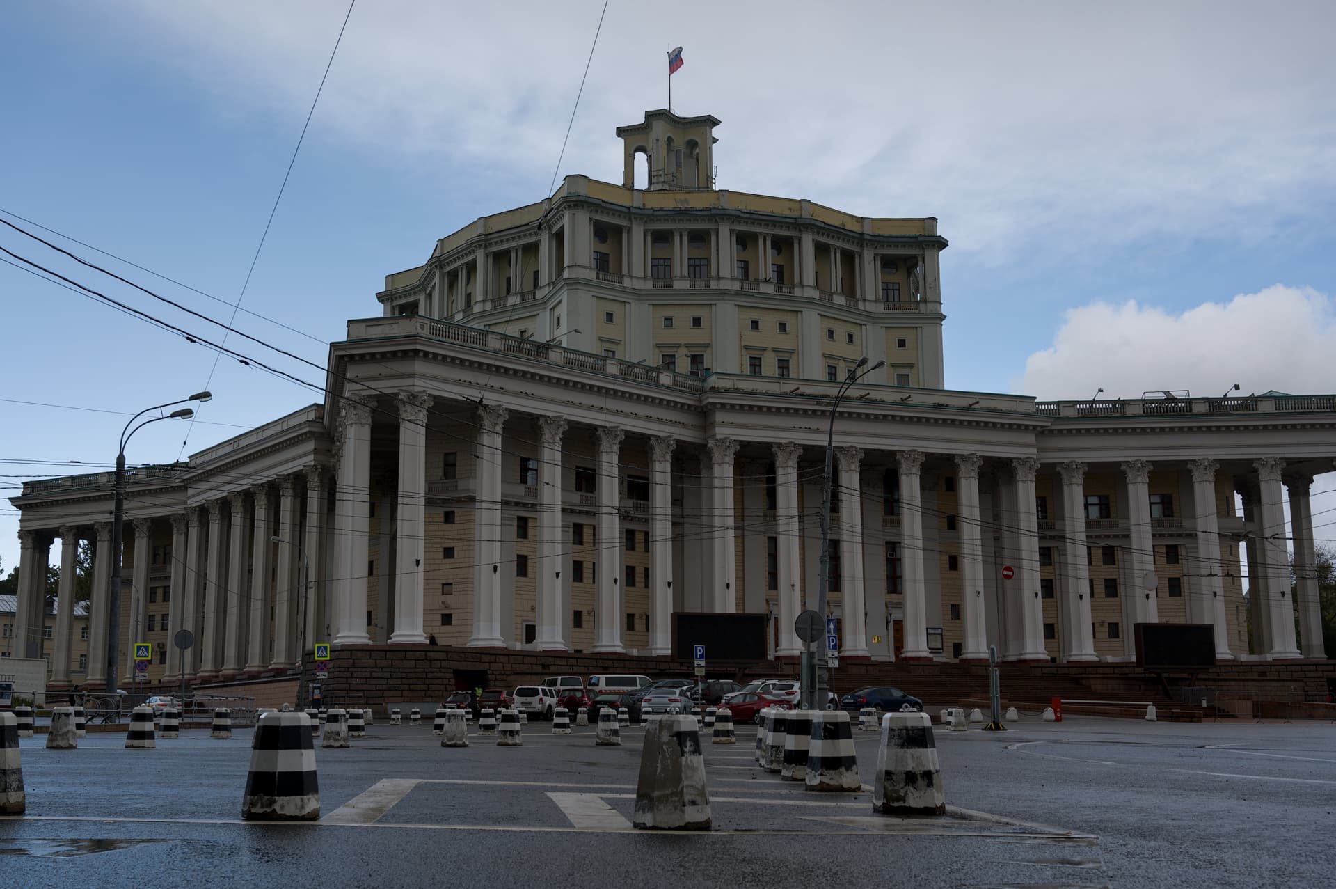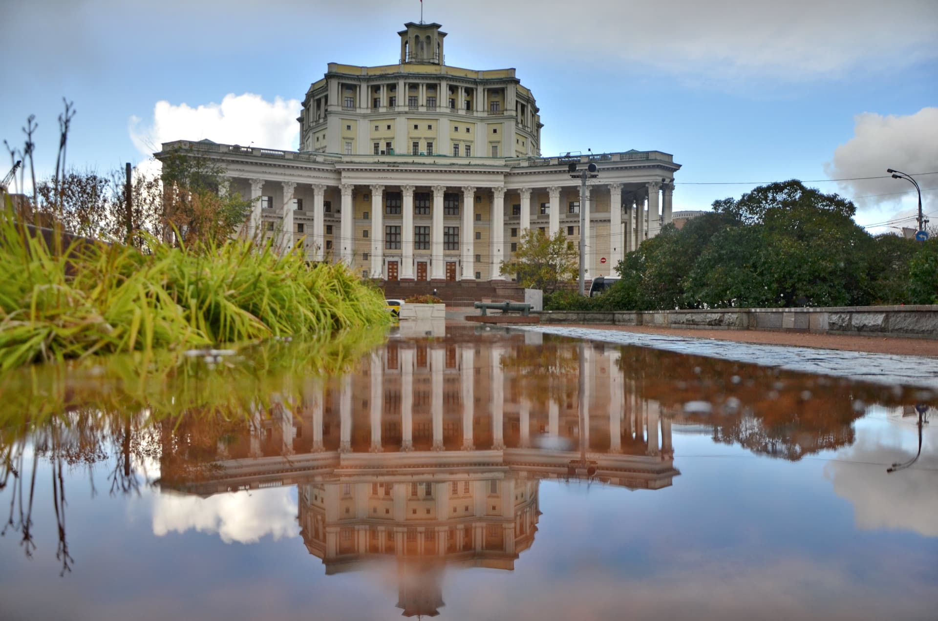 Здание театра – один из ярчайших примеров так называемого сталинского ампира, не имеющее себе аналогов, грандиозное по масштабам. В форме пятиконечной звезды здание было построено в 1934–40 гг. на Суворовской площади по проекту К.С. Алабяна и В.Н. Симбирцева (при участии Б.Г. Бархина).