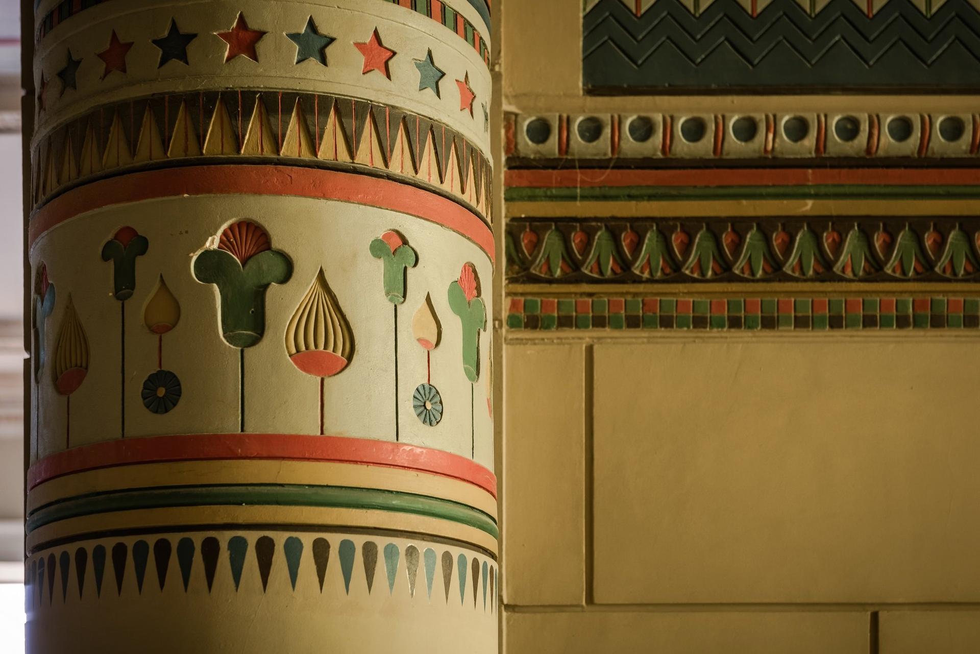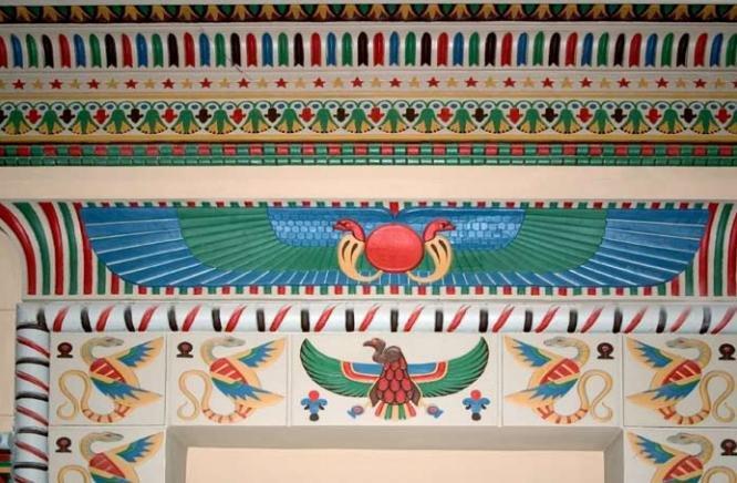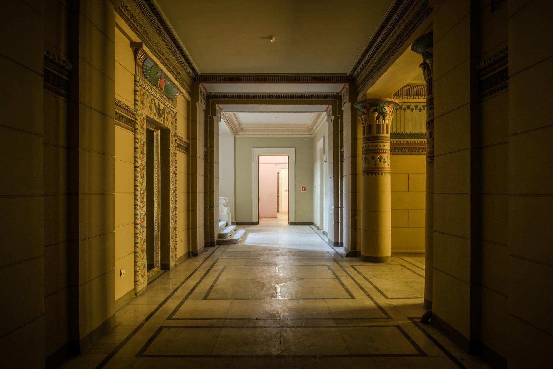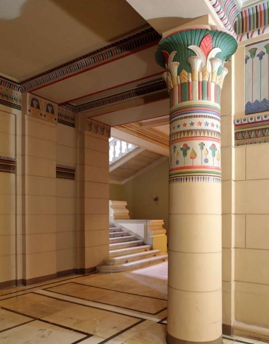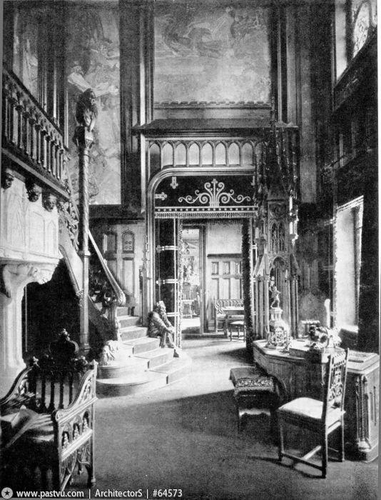 Among the things designed by Schechtel for the mansion on Vvedensky Lane were a study with two-storey windows and a staircase leading to the first floor, a library, a parlour, and a hallway in the Egyptian style. The architect invited the famous artist Mikhail Vrubel and the young sculptor Sergey Konenkov to work on the interiors. The study and the library were made in Schechtel’s favorite Gothic style: they are fully paneled with wood, their coffered ceilings adorned with carvings and paintings; the cabinet is lit with high stained glass windows. Also decorated with exquisite carvings is the staircase that leads from the study to the library on the first floor . Its unusual appearance is amplified by the figures of a dragon and a gnome that is ‘sitting’ on the steps. Under the staircase, a small marble fireplace was installed. The wooden panels of the study on the second story level were decorated with large paintings depicting scenes from Goethe’s Faust (these have been moved to Tretyakov’s Gallery).The Rococo-style parlour (sometimes also called ‘the corner office’) is ornamented with French tapestry. Its ceiling, adorned with gilded carvings, is partially made of glass, and has backlighting provided by electric lamps. Fortunately, the rich interiors of the mansion survive to this day, almost intact.