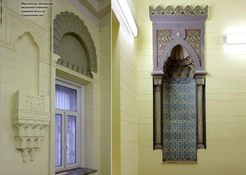 Для особняка во Введенском переулке Шехтель спроектировал двухсветный кабинет с лестницей на второй этаж, библиотеку и рокайльную гостиную, а также вестибюль в египетском стиле. К работе над интерьерами архитектор привлек известного художника Михаила Врубеля и молодого скульптора Сергея Коненкова.