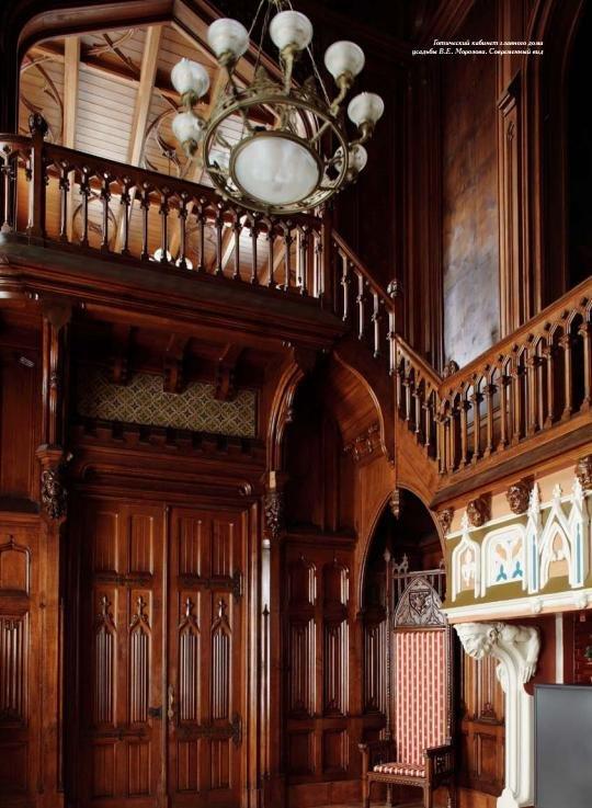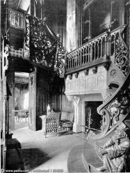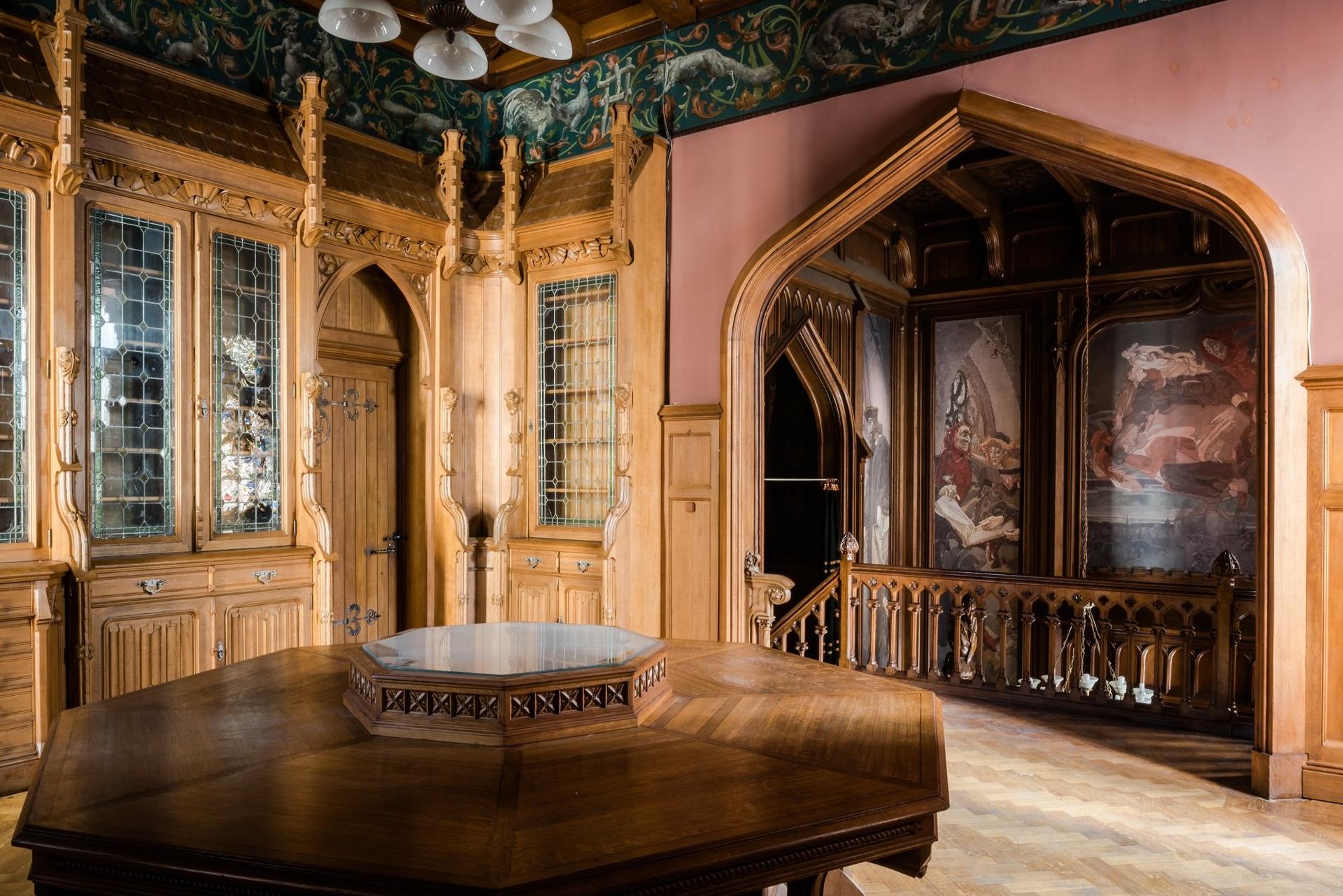 Кабинет и библиотека особняка выполнены в излюбленном архитектором готическом стиле, они целиком отделаны деревом, кессонированные потолки оформлены резьбой и росписями, кабинет освещается высокими витражными окнами. Украшенная изысканной резьбой лестница, ведущая на второй этаж, в библиотеку, сама по себе является произведением искусства, ее необычный образ дополняют деревянные фигуры дракона и гнома, «сидящего» на ступеньках. Под лестницей устроен большой мраморный камин. Деревянные панели кабинета в уровне второго этажа были оформлены большими живописными панно, созданными Михаилом Врубелем на темы «Фауста» Гёте (сейчас они хранятся в собрании Третьяковской галереи). Гостиная в стиле рококо (иногда ее еще называют угловым кабинетом) декорирована французскими гобеленами, ее украшенный золоченой резьбой потолок частично сделан стеклянным, с подсветкой электрическими лампами. К счастью, эти великолепное убранство особняка сохранилось до нашего времени практически в неизменном виде.