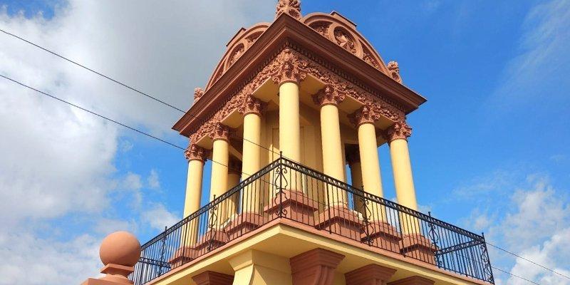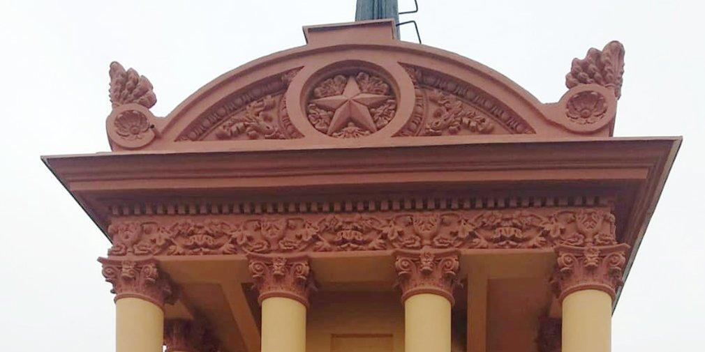 Реставрация началась еще в холодное время года, поэтому специалистам приходилось работать в специально сооруженном тепляке, позволяющем поддерживать необходимую температуру на площадке. Ротонда в основном создана из бетона — сложного в обработке материала. Чтобы его сохранить, мастера зачищали и обрабатывали специальными составами отдельные участки, восстанавливали некоторые утраченные детали. Так реставрировали декоративные элементы — акротерии и фронтоны с советской символикой в виде звезд.