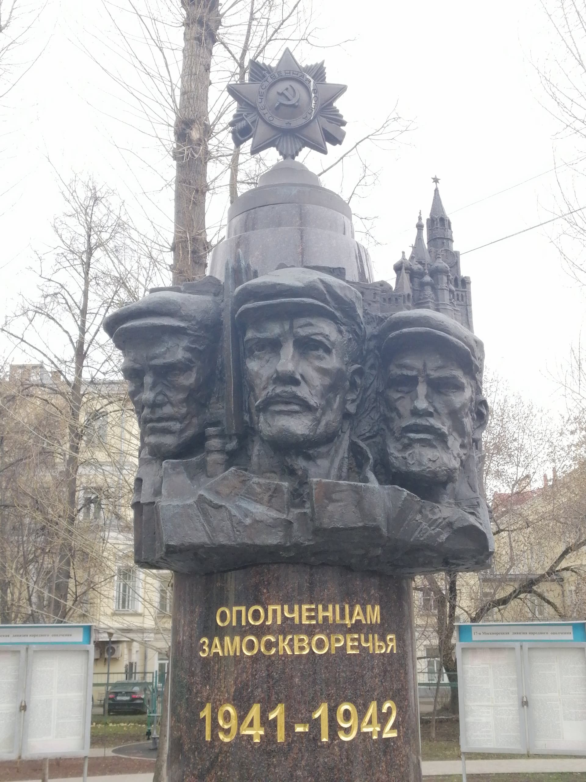 Из района на Великую Отечественную войну отправилось более 18 000 человек. Круглый гранитный обелиск установлен на квадратном основании. На вершине — бронзовый орден Отечественной войны. В верхней части обелиска — бронзовый горельеф, на котором изображены лица мужчин-ополченцев. Под горельефом памятная надпись: «Ополченцам Замоскворечья. 1941-1942». С задней стороны постамента надпись, на которой сообщается об авторах памятника.
