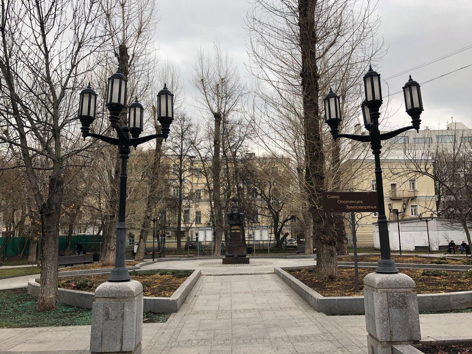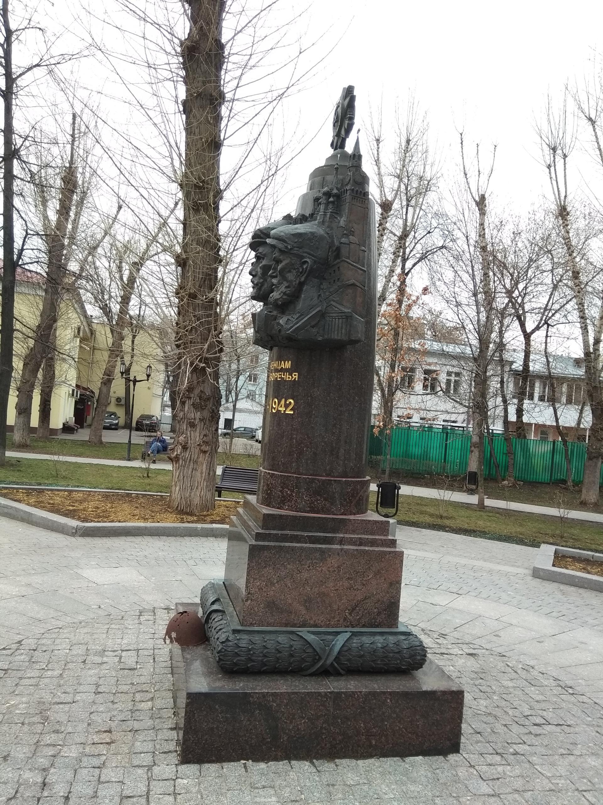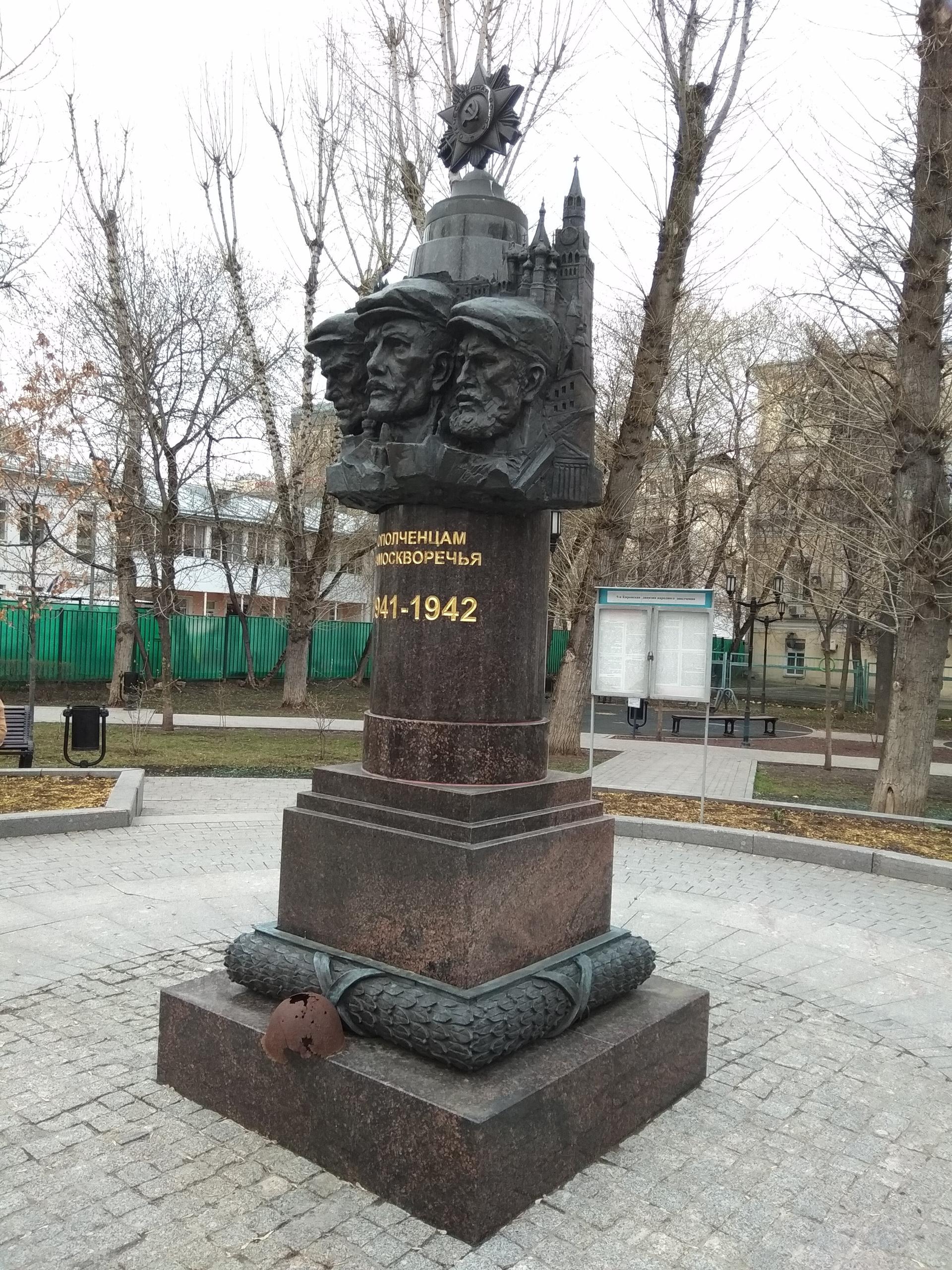 Из района на Великую Отечественную войну отправилось более 18 000 человек. Круглый гранитный обелиск установлен на квадратном основании. На вершине — бронзовый орден Отечественной войны. В верхней части обелиска — бронзовый горельеф, на котором изображены лица мужчин-ополченцев. Под горельефом памятная надпись: «Ополченцам Замоскворечья. 1941-1942». С задней стороны постамента надпись, на которой сообщается об авторах памятника.