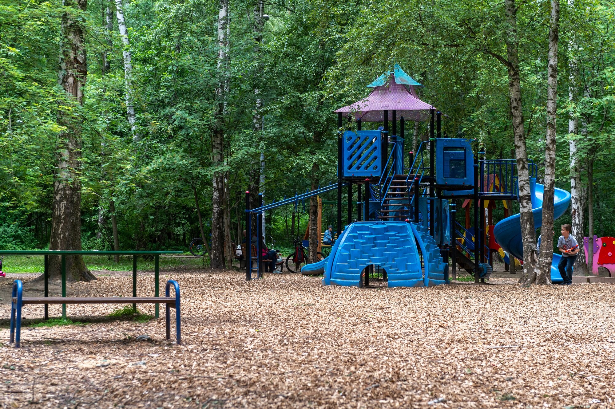 По пути обратите внимание на современные площадки по обеим сторонам дороги. Справа находится игровая зона для детей, а слева – спортивный уголок для взрослых. Довольно удобно – пока малыши возятся в песочнице, мамы могут заняться своей физической формой, не отрываясь от наблюдения за чадом. А мы тем временем направляемся к выходу из парка.