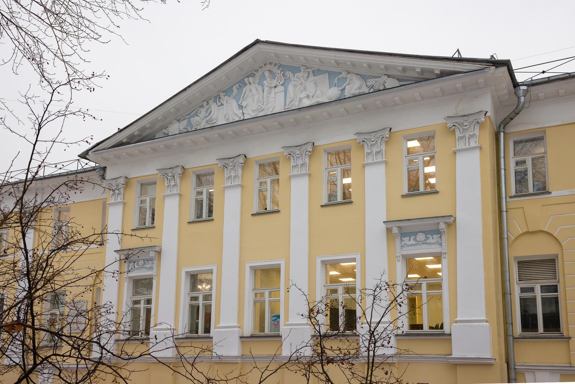 В ходе реставрационных работ, завершившихся в 2022 году, специалисты восстановили интерьер усадьбы начала XX века: воссоздали мраморные подоконники, исторические каменные лестницы, а также деревянные потолочные карнизы с фризом и лепной декор. Сохранившиеся дубовые двери начала XX века отреставрировали и покрасили. В аудиториях и кабинетах воссоздали художественный паркет XIX века из дуба.