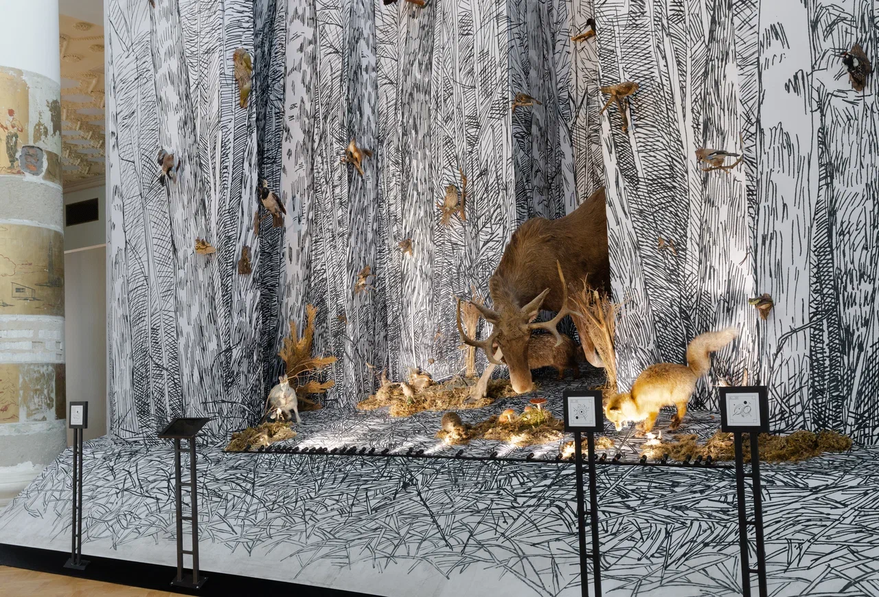 В центральной части павильона располагается инсталляция диорамного типа Алексея Трегубова «Лосиный остров». В ней представлены объекты из коллекций музея. Художник представляет нам пространство лесного участка как театральную сцену, где воображаемый лес – это кулисы, открывающие нам персонажей пьесы — животных и растения, грибы. Это пространство позволяет поразмышлять сразу о трёх признаках живого: о многообразии, о дискретности и целостности и о ритмичности в природе.