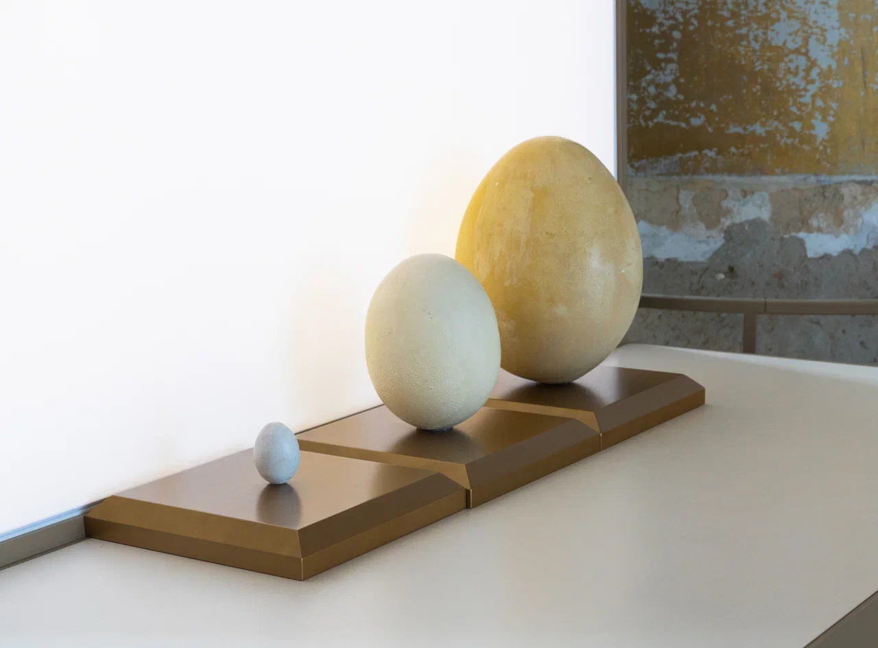 Первый признак живого мы назвали «Без клетки жизни нет!». Клетки бывают очень разными, а одна из самых больших клеток – это яйцо. Если быть точным, то именно желток яйца, который окружают разные оболочки. Вообще клетка довольно сложно устроена, и обычно клетки очень маленькие, даже микроскопические. А здесь мы можем увидеть и даже потрогать макеты яиц некоторых птиц — курицы, страуса и эпиорниса. Самое большое яйцо — это яйцо эпиорниса, гигантской вымершей птицы. А вот яйца современных птиц мы найдём в витрине с гнёздами.