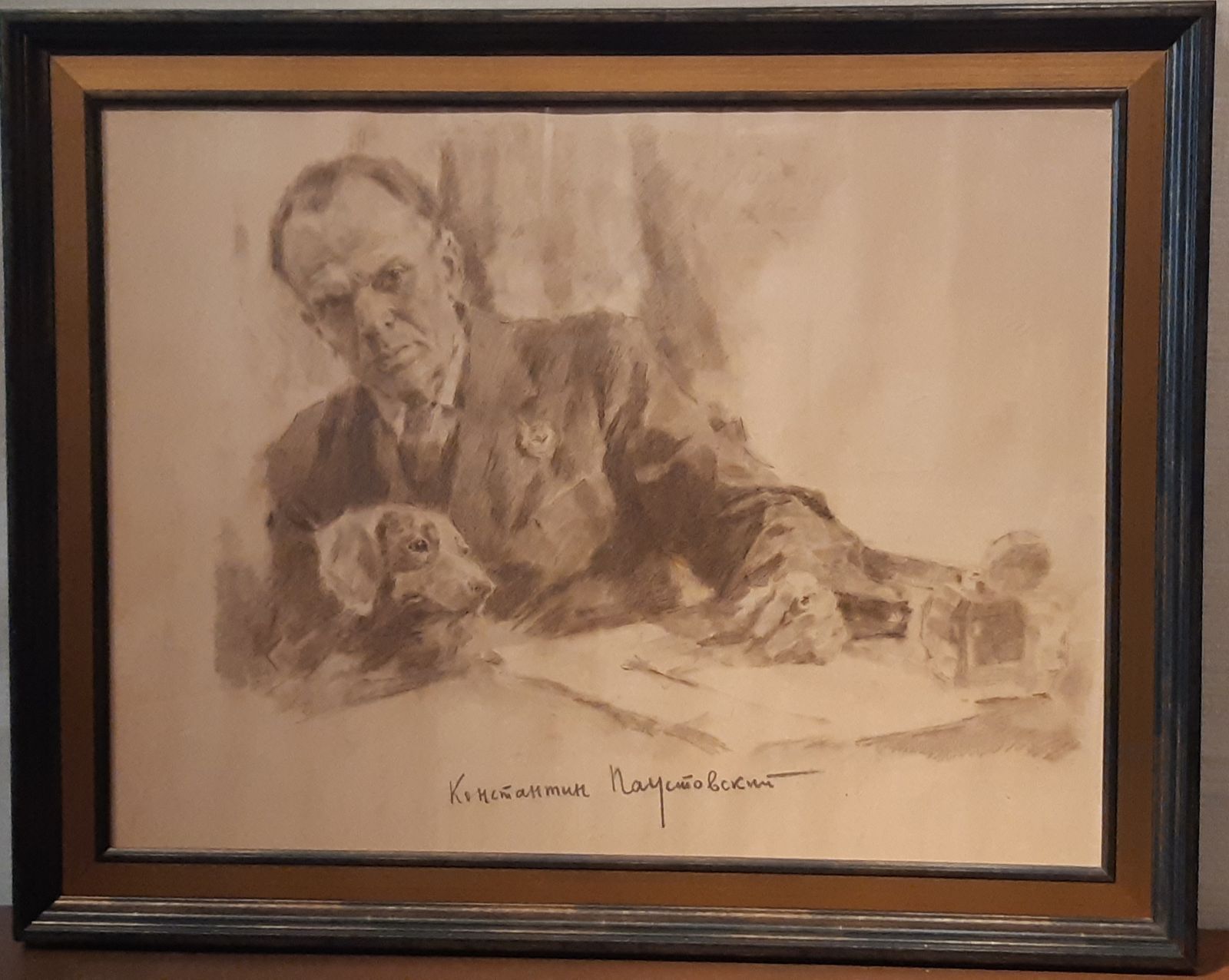 Портрет был написан с натуры в московской квартире писателя в Лаврушинском переулке. На портрете писатель изображен на своем рабочем месте, за письменным столом, на столе чернильница и рукописи. Рядом с писателем его любимая собака - такса по кличке Фунтик. В нескольких произведениях писателя 1930 –х годов Фунтик представлен как персонаж. По хранящимся в фондах музея документам известно, что Фунтик - такса коричневого цвета с желтыми подпалинами, была приобретена Валерией Владимировной Навашиной, второй женой писателя. Собака родилась 16 июля 1938 года, принимала участие в выставках. Фунтик упоминается в таких произведениях писателя, как "Жильцы старого дома", "Прощание с летом" и других рассказах мещерского цикла. В годы Великой Отечественной войны, в эвакуации, Фунтик принимал участие в съемках Алма-атинской киностудии художественных фильмов.