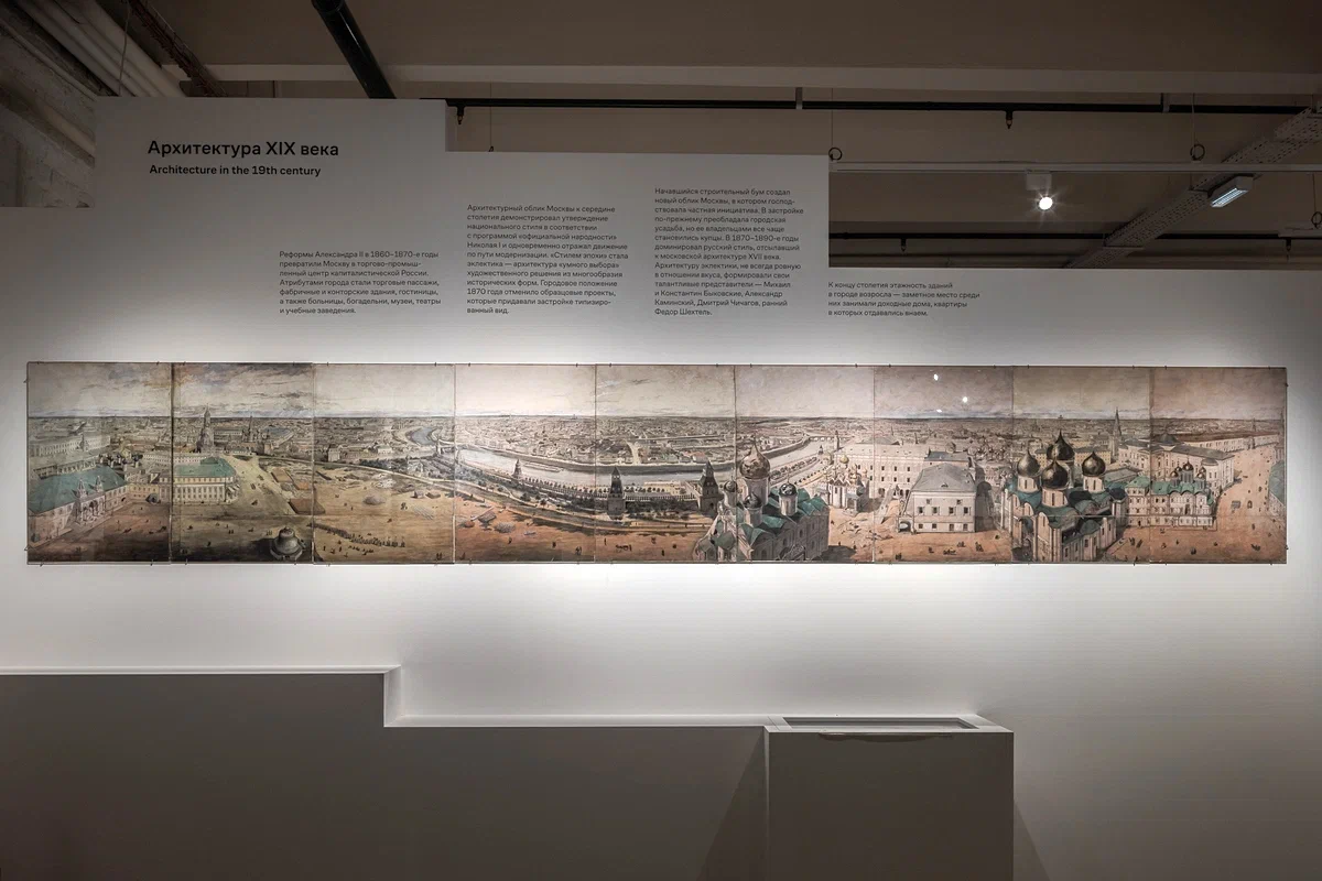Обернувшись назад, вы увидите панораму города, созданную в середине XIX века французским художником Акари Бароном. Он рисовал ее в течение двух летних сезонов с колокольни Ивана Великого в Кремле. В 1847 году панорама была литографирована и издана в Париже. Долгое время акварельный оригинал считался утраченным. Но в 1960-х годах в дар музею были переданы девять листов, купленные в антикварном магазине Парижа. На них в отличие от литографии Храм Христа Спасителя и Кремлевский дворец изображены в конце строительства.