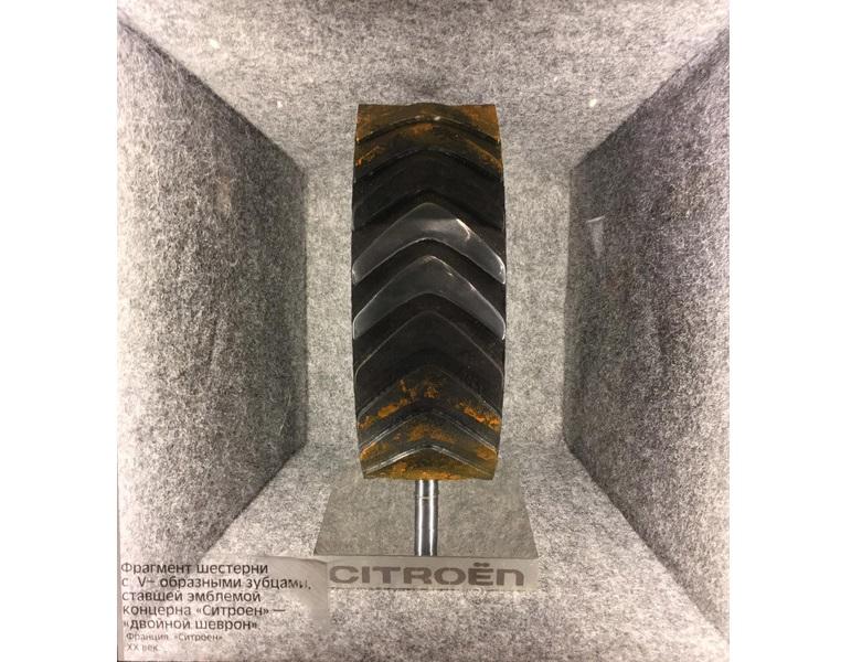 Фрагмент шевронного колеса с символически отполированной эмблемой компании был подарен нашему музею фирмой Ситроен.