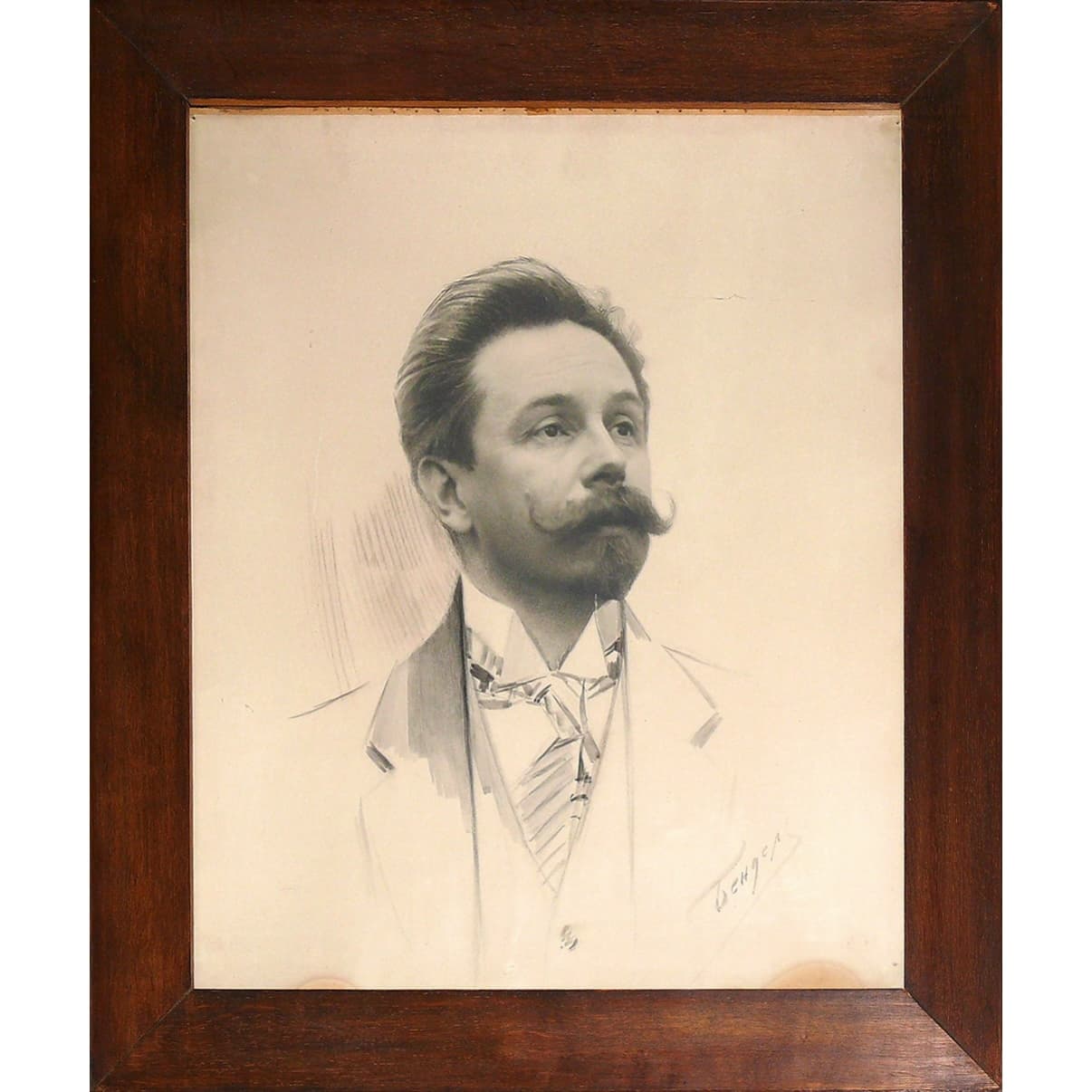 Бендель акцентирует внимание на голове и шее композитора, убирая ненужные детали и добавляя графические элементы в виде костюма, создающие впечатление, что это не фотография, а рисунок. В отличие от некоторых других снимков, здесь Скрябин запечатлён в официальном стиле с нейтральным выражением лица. Тем не менее, Бендель смог превратить его студийный портрет в произведение искусства.