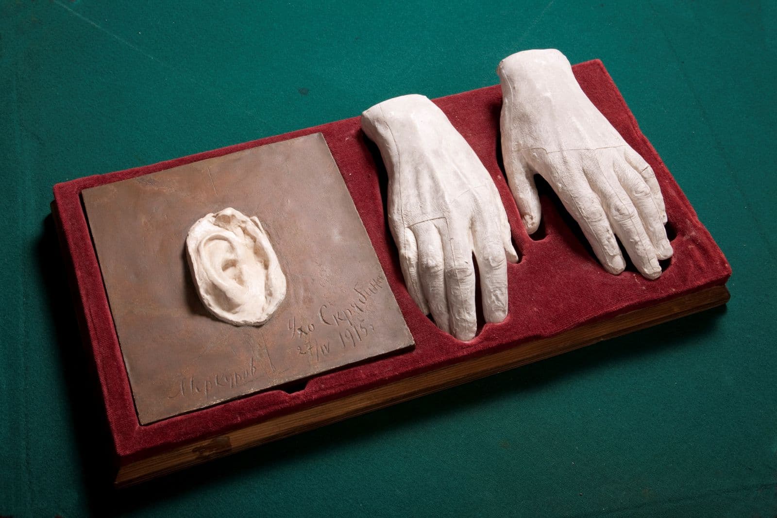 В небольшом шкафу-горке в простенке между окнами находятся посмертные слепки рук и уха Скрябина, выполненные известным скульптором Сергеем Дмитриевичем Меркуровым. В виду того, что в последние дни жизни Александра Николаевича врачи, боровшиеся с болезнью композитора, произвели на его лице четыре операции, посмертную маску сделать было практически невозможно.