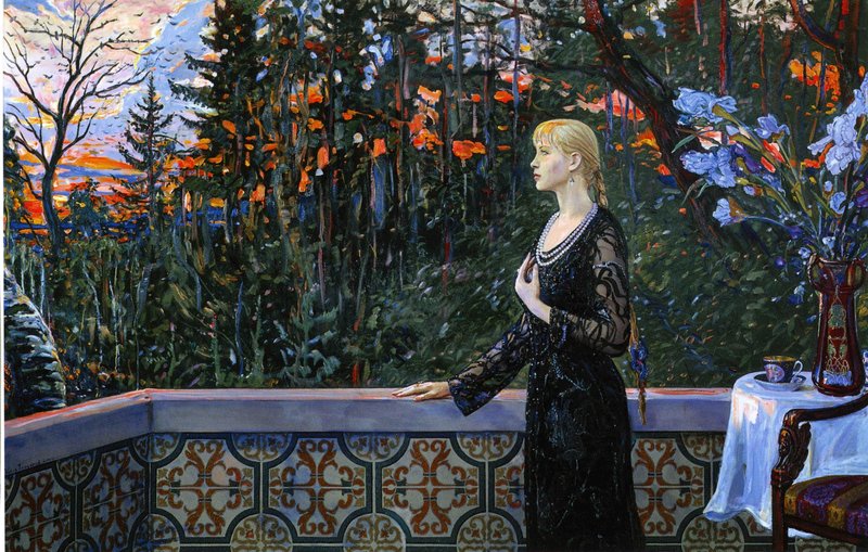 Моделью для картины «Канун. 1917 год» послужила Инесса Дмитриевна Орлова-Глазунова, жена, муза и спутница художника, до последних дней жизни. Ее узнаваемый образ нередко появляется в картинах Ильи Глазунова, начиная с 1990-х годов. В данном произведении портрет жены помещен в исторический контекст. Обстановка балкона усадебного дома ностальгически напоминает об изысканной красоте дворянских гнезд. Взгляд героини устремлен на тревожный закат, на фоне которого выделяется силуэт сухого дерева и слетающихся к нему ворон − предвестников роковых грядущих событий. Картина проникнута ощущением скорых революционных потрясений, которые разрушат старый уклад и приведут за собой неясное и тревожное будущее. Вместе с тем, тонкое колористическое решение картины и мастерство художника в передаче нюансов освещения закатного солнца акцентируют внимание зрителя не на сюжетной драме, а на музыкально-лирической красоте образа.