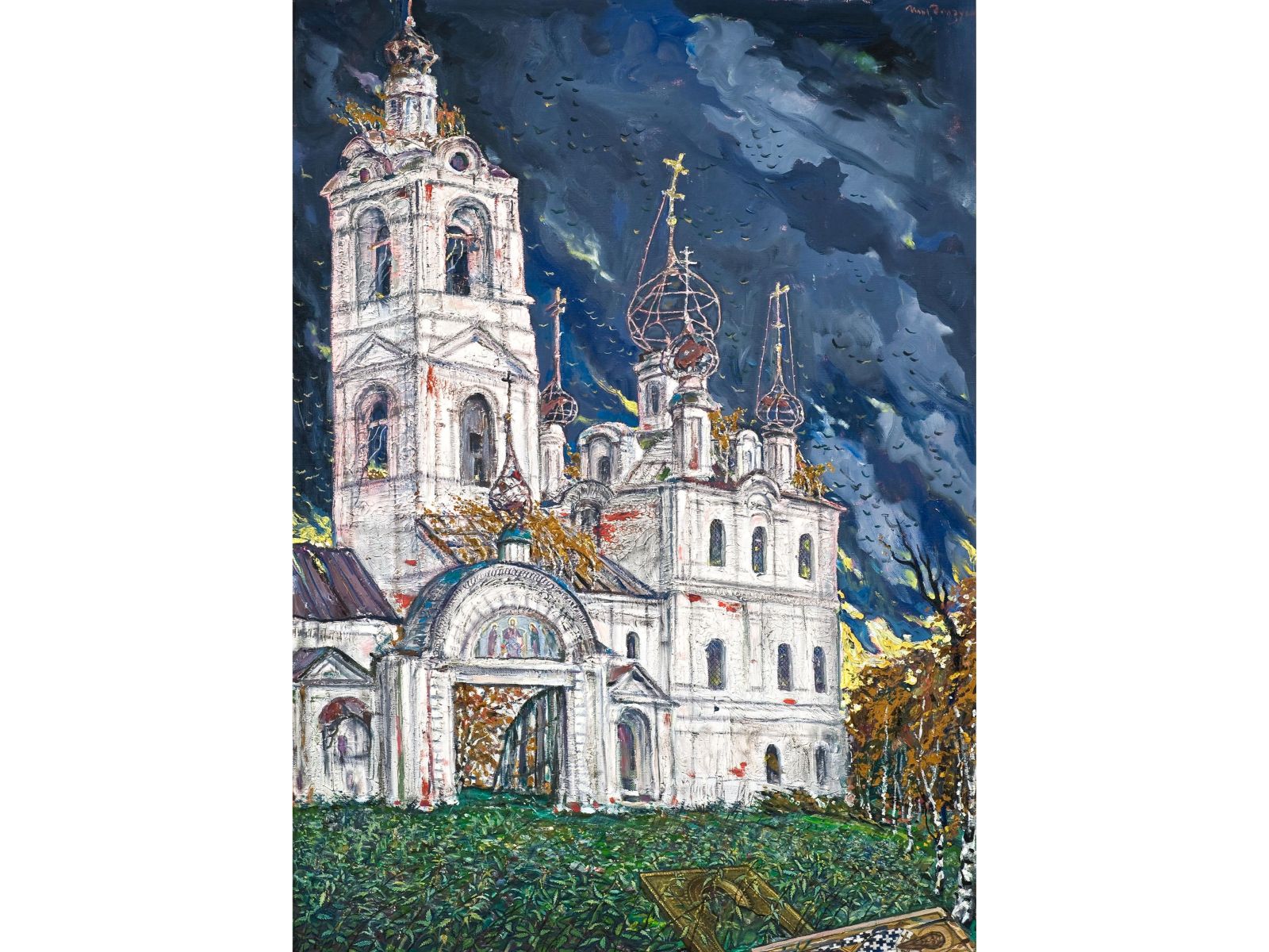 «Коммунисты прошли» − произведение сильного драматического звучания, напоминающее о страшных следах советской эпохи. Подобные руины художник нередко встречал во время поездок по стране, запечатлевая их в своих произведениях. Храм полуразрушен, обшивка с куполов сорвана, а на земле лежит оклад иконы, символизируя поругание христианских святынь… Одушевляя трагический образ, Илья Сергеевич Глазунов уподобляет смертельным ранам выбоины в белоснежном «теле» храма. Вот-вот мрачное небо разразится грозой, и дождь будет оплакивать эту скорбную жертву.