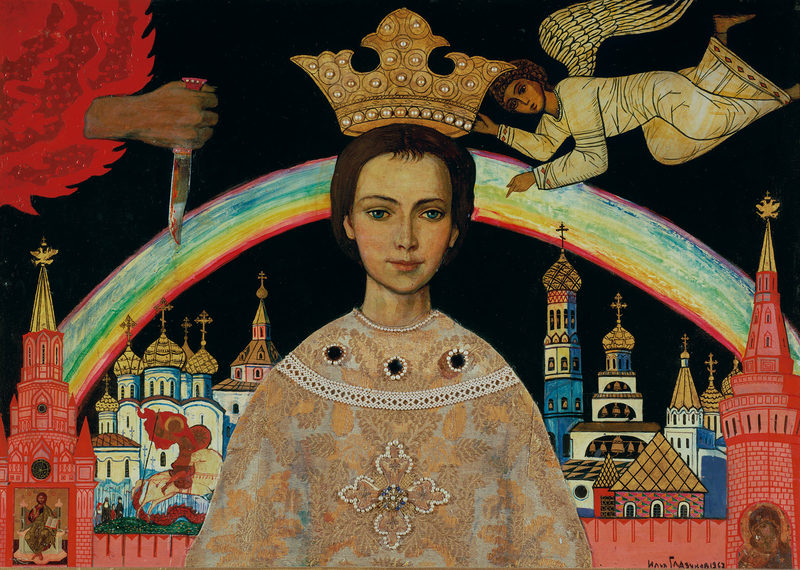 Неоднократно в своих произведениях Илья Сергеевич Глазунов обращался к теме трагической гибели младшего сына Ивана Грозного, произошедшей в Угличе в 1591 году. Картина в технике инкрустации под названием «Легенда о царевиче Димитрии» 1967 года представляет образ мальчика, над головой которого занесена рука рока, предвещая его кончину. Следуя иконописной традиции, Глазунов совмещает в одном произведении разновременные события: момент гибели ребенка и последующую канонизацию убиенного царевича Димитрия коронующим его Ангелом. Несомненна параллель, проводимая художников между трагедией прерванного рода Рюриковичей и другой, случившейся три столетия спустя. Не случайно эту работу и картину «Царевич Дмитрий», в советские годы снимали с выставок – цензура усматривала в них образ царевича Алексея, сына последнего российского императора.
