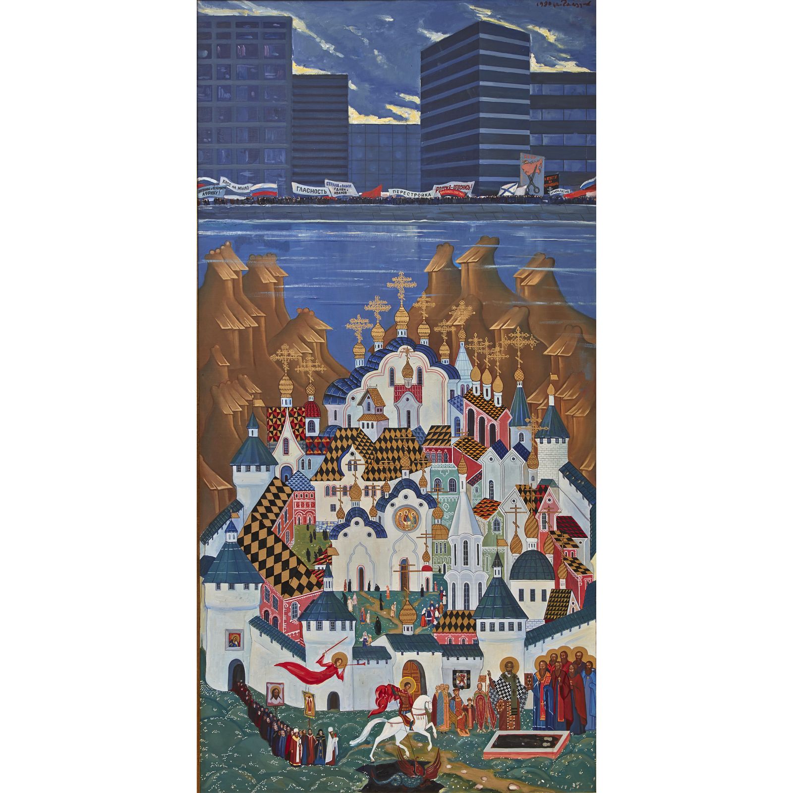 В картине «Легенда о граде Китеже» Илья Глазунов обратился к сказанию, которое повествует о спасении древнего города во времена татаро-монгольского завоевания. Батыевы полчища подступали к стенам Китежа, и, казалось, город и его жителей ждала неминуемая гибель. Но Господь не допустил поругания над христианскими святынями. Чудесным образом город стал невидимым для ослепленных врагов: десять дней и ночей безуспешно искали они город. Напоминало о Китеже лишь отражение его церквей и княжеских теремов на водной глади озера Светлояр.