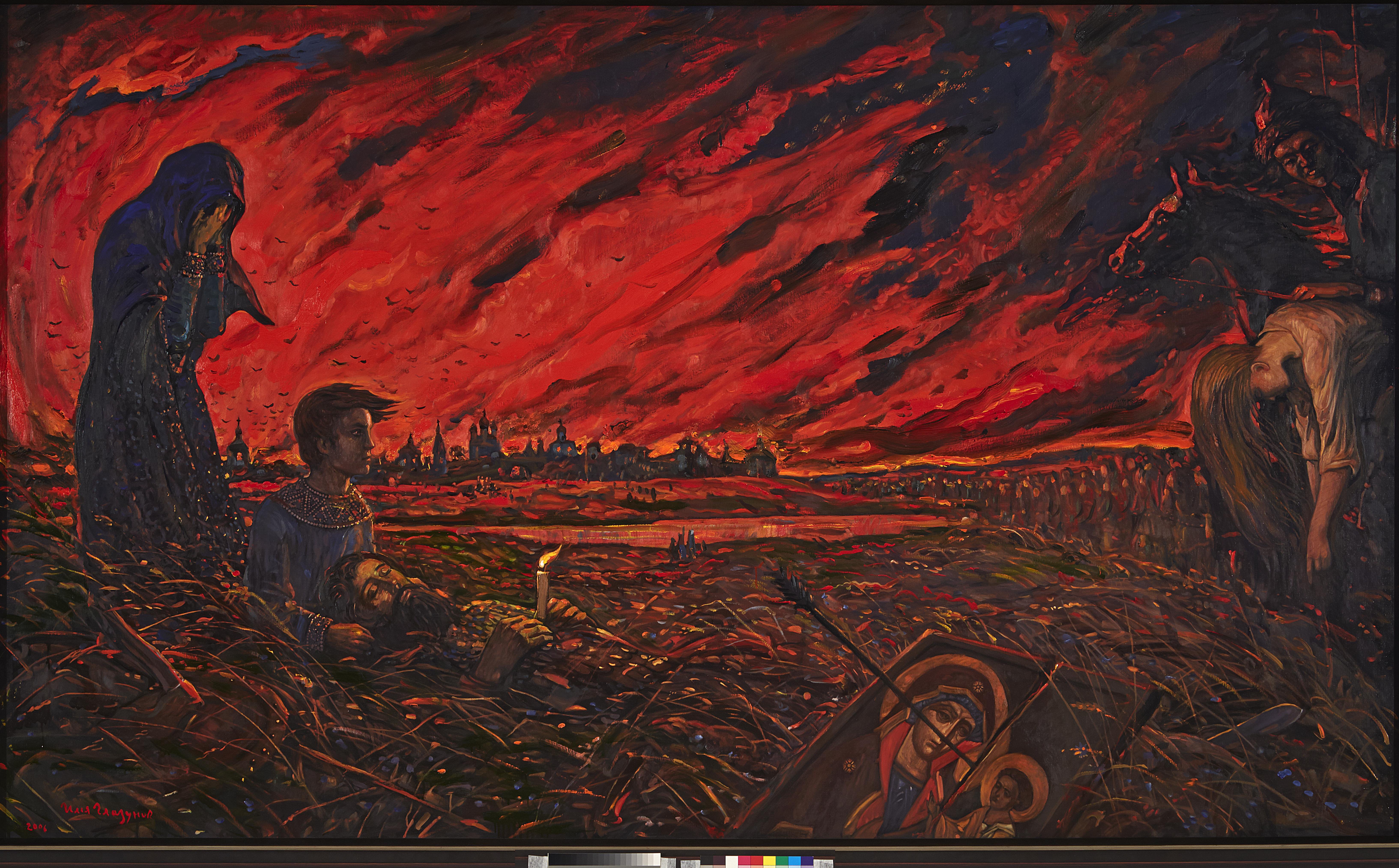 Эпоха разорения татаро-монголами Русской земли нашла отражение в картине «Нашествие. Детство Андрея Рублева». Одна из символичных деталей произведения − икона, пронзенная стрелой. Образовавшаяся трещина разделила Богоматерь и Богомладенца Христа. Так же трагически расколото было княжескими усобицами Русское государство. Языки пламени взвиваются до звездного неба, – так озаряет пожар горящего города ночную тьму. Длинным строем уводят в полон татары русских женщин, детей, увозят награбленные трофеи. На фоне этого драматичного пейзажа предстает фигура будущего великого иконописца Андрея Рублева. Просветленный образ мальчика в картине становится символом надежды, напоминающим о том, что даже в самые тяжелые времена Русская земля рождала лучших своих сыновей, которым испытания времени лишь придали сил для ратных и духовных подвигов.