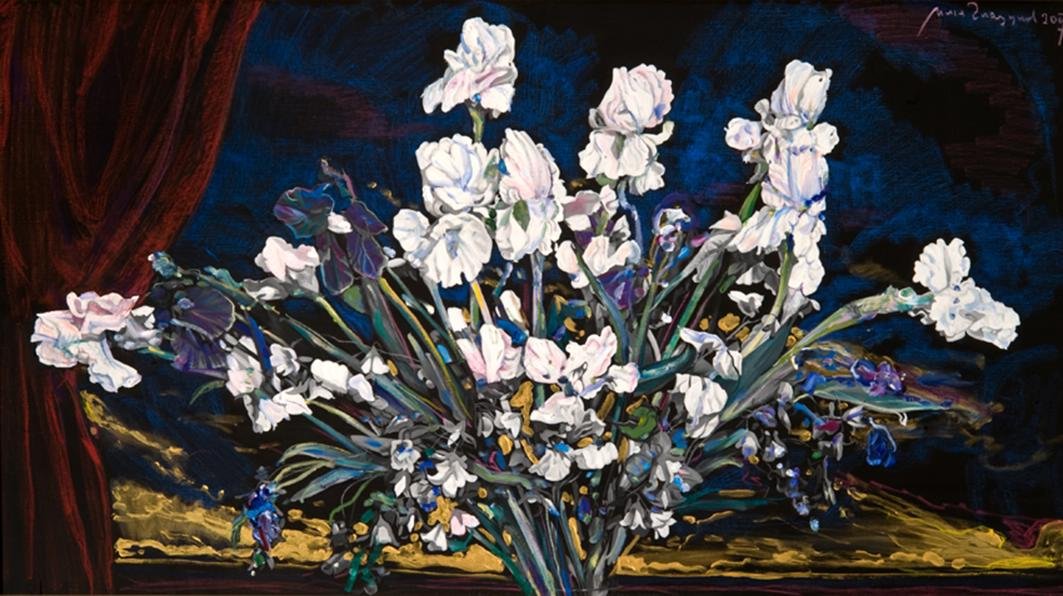 Предметом для изображения мастер избрал букет с ирисами – изысканными цветами стиля модерн, на фоне темного окна, за которым предстает абстрактный пейзаж, решенный с большим живописным темпераментом. Наряду с темно-красным занавесом он придает произведению эмоциональную насыщенность и ощущение драматизма. Ваза оставлена за пределами холста, стебли вырастают будто из рамы, заполняя горизонтальный формат картины красотой нежных лепестков. Натюрморт написан сочно, широким пастозным мазком темперы в сочетании с сухими пастельными дорисовками. Это техническое решение позволило художнику добиться впечатляющего декоративного эффекта.