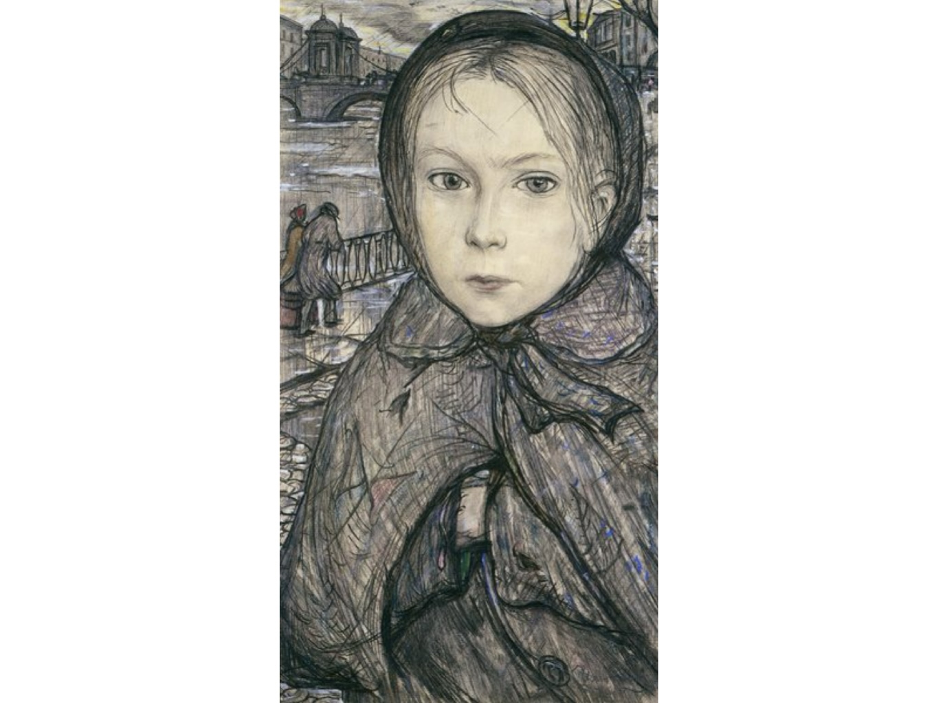 Смысловой центр графического листа – лицо девочки. Она постепенно познает себя и мир, – мир, который с самых юных лет был для Неточки полон горестей и лишений. «Я поняла, и уж не помню, как, что в нашем углу — какое-то вечное, нестерпимое горе», – признается девятилетняя Неточка на страницах повести Ф.М. Достоевского. Не только в иллюстрациях к этому произведению, но и в образе Нелли, героини «Униженных и оскорбленных», И.С. Глазунов глубоко разработал одну из важнейших идей философии писателя о том, что нет оправдания жестокости мира, в котором пролита хотя бы одна слезинка страдающего ребенка.