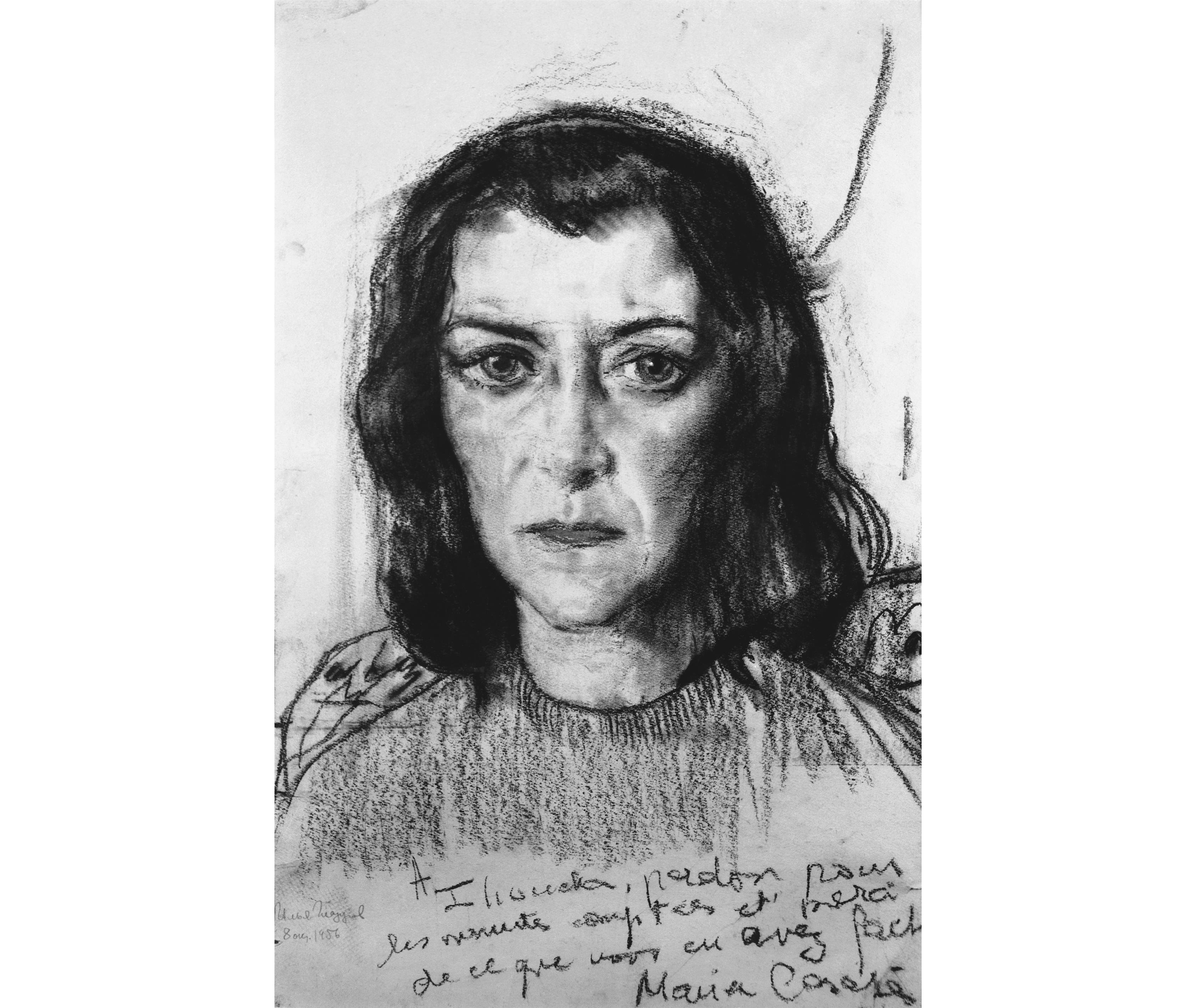 Образ Марии Казарес поражает сложностью психологической характеристики. Французская актриса испанского происхождения, вошла в историю кино и театра преимущественно в драматическом и трагическом амплуа. В ее театральном репертуаре были роли Грушеньки, героини романа Ф.М. Достоевского «Братья Карамазовы», и Пелагеи Власовой из романа Максима Горького «Мать». Успешный дебют свел актрису с писателем, философом и драматургом Альбером Камю, после чего Казарес стали называть «музой экзистенциализма». Илья Сергеевич Глазунов тонко почувствовал ее амплуа и убедительно передал контраст внешней сдержанности и внутренней силы и страсти. При виде готового портрета восхищенная мастерством молодого художника Казарес оставила на графическом листе восторженный отзыв.