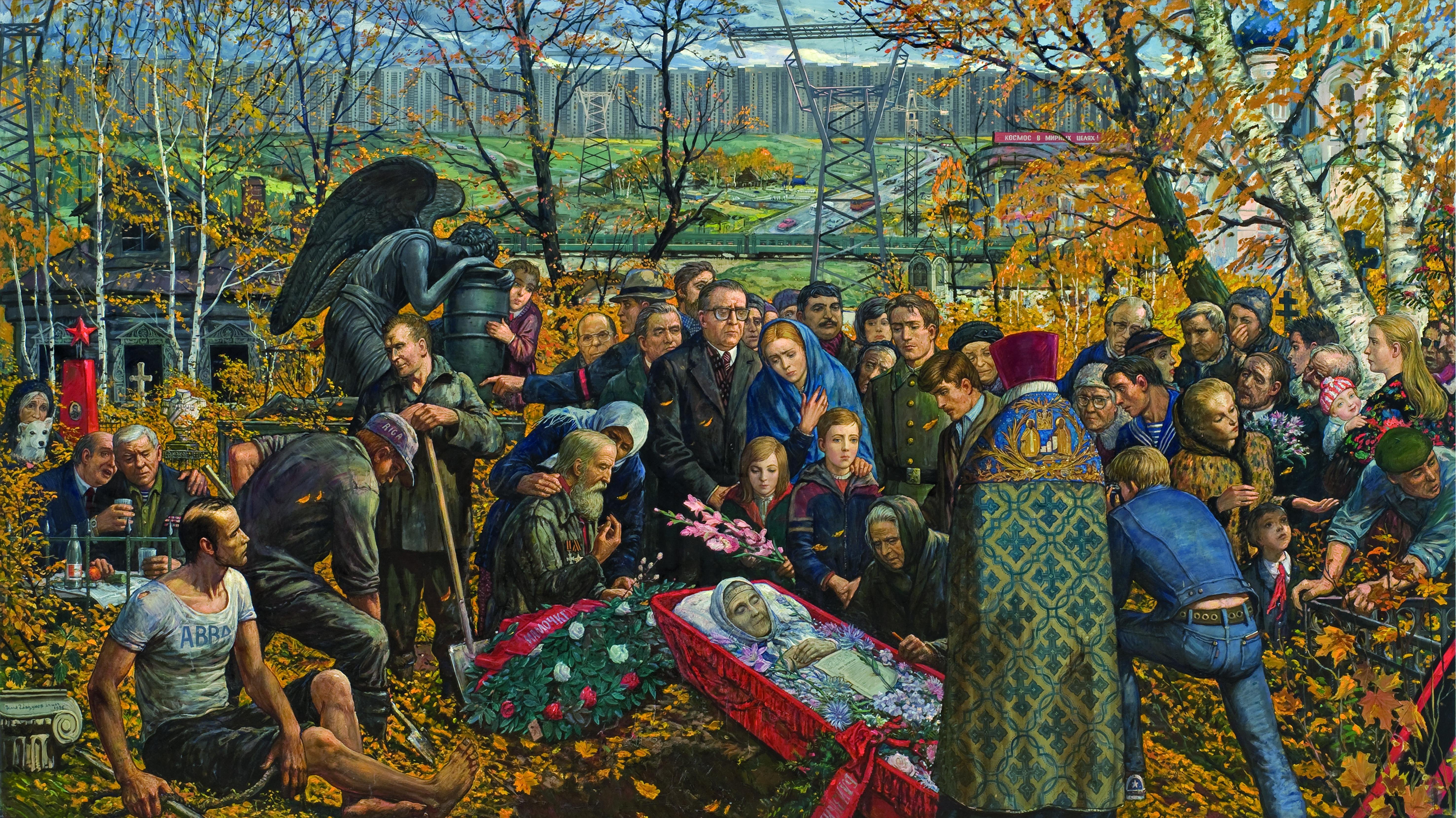 В картине «Прощание» 1986 года отражены размышления художника о пути России и современников в XX столетии. На фоне пейзажа пасмурного осеннего дня перед зрителем разворачивается сцена похорон. Люди пришли на кладбище, чтобы проститься с пожилой женщиной, матерью и бабушкой, представителем эпохи, хранившей духовные и эстетические ценности, уходящие вместе с усопшей. О красоте хранимых ценностей в картине напоминает опустевший старый дом с резными деревянными наличниками, – но на горизонте вырастает сплошной серой лентой пришедшая на смену деревянному узорочью безликая современная застройка… Тема прощания в картине приобретает широкое значение: обыденную сцену похорон художник осмыслил как прощание с самой уходящей Россией.