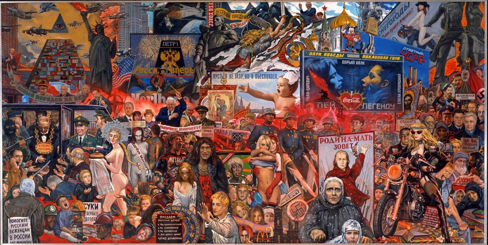 Плакат «Родина-мать зовет!» напоминает в произведении о недавнем подвиге советского народа в борьбе с фашизмом. Плакат прорван, а его героиня изображена в образе нищенки, просящей подаяние. Неподалеку продаются военные ордена – получает свою цену то, что еще совсем недавно для людей было бесценным. Страна превращена в тотальный рынок, где продается все, что только можно выставить на продажу. Власть денег воплощает образ богача, перед которым вынуждены кланяться выдающиеся умы, деятели науки. Вторит ему один из символов материальных ценностей – американский доллар, использованный в оформлении рамы.