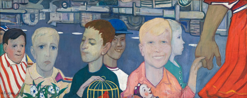 В жанровой картине «Советские дети переходят улицу» Илья Сергеевич Глазунов, обратился, как и во многих своих работах из цикла «Город», казалось бы, к обыденной теме. Композиция нарочито обрезана, – и мы лишь видим красную юбку, развевающуюся словно знамя, за которым идет эта веселая группа детей. Автор изобразил мальчиков разных национальностей. Он с интересом отметил в их лицах, мимике, поведении различные характеры. Образ ребенка с недетски печальным взглядом – важный сквозной мотив работ Ильи Глазунова.