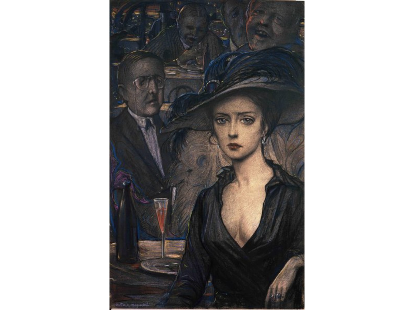 Илья Глазунов еще в юности полюбил поэзию А.А. Блока о Прекрасной Даме с ее таинственной красотой и недоступностью. Неоднократно в своем творчестве художник обращался к этому образу, по-разному его интерпретируя, как в живописных, так и в графических произведениях. Иллюстрация под названием «В ресторане» одна из немногих точно следует поэтическому описанию знаменитого стихотворения «Незнакомка»: «И веют древними поверьями ее упругие шелка, и шляпа с траурными перьями, и в кольцах узкая рука…».