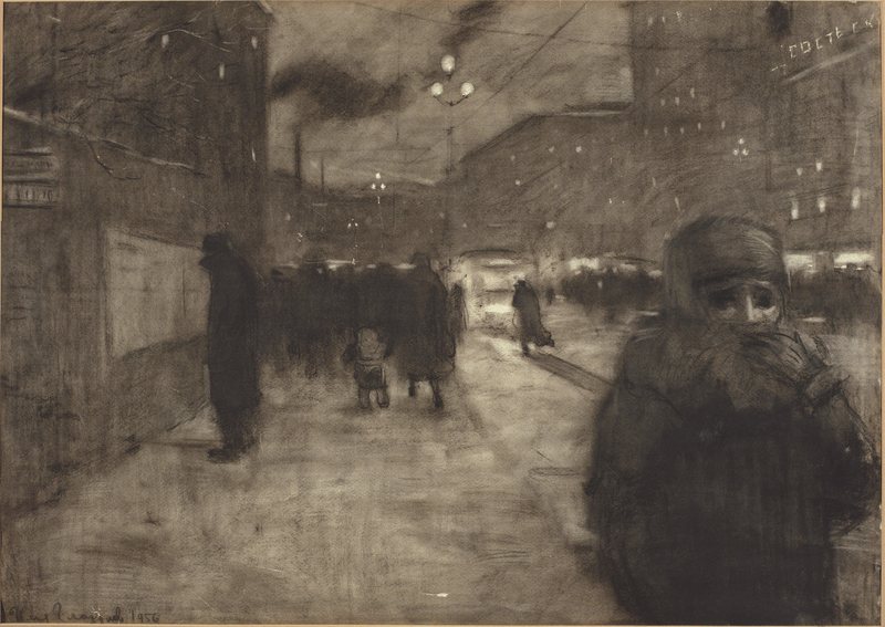 Графическое произведение «Вечерний Ленинград» − окно в мир любимой художником Петроградской стороны родного города, какой он видел ее в 1956 году. В то время еще не было яркой иллюминации современного Петербурга, фонари и огни автомобилей тускло освещали вечерние оживленные улицы. Чадит заводская труба жители суетно спешат по своим делам, их окружают коробки домов с многочисленными окнами, за каждым из которых своя жизнь… Передавая атмосферу города с ее дымкой вечернего сумрака, И.С. Глазунов виртуозно раскрыл художественные возможности мягких материалов − чёрного соуса и угля.