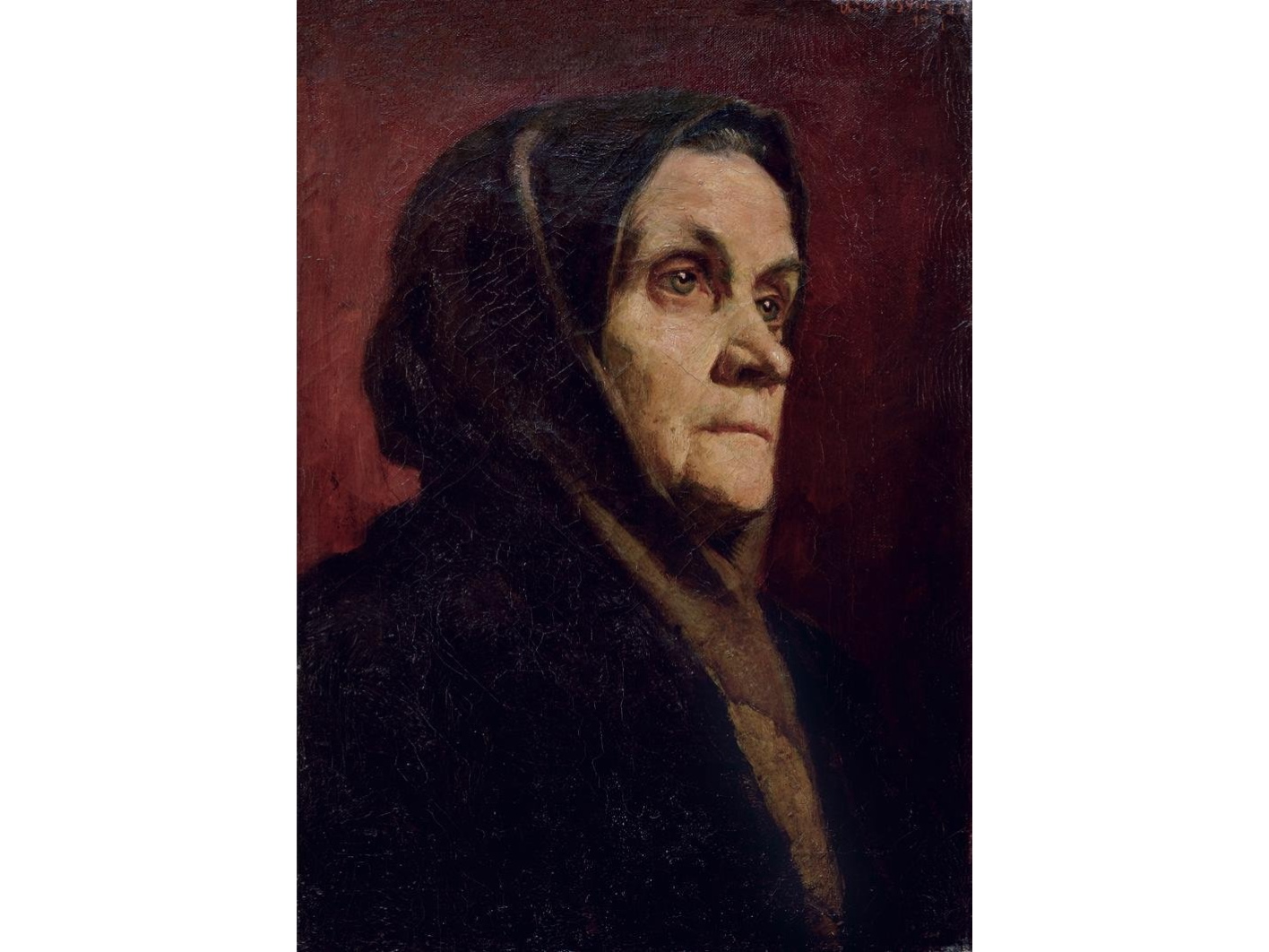 Портрет пожилой женщины в платке является этюдом для картины «Дороги войны», задуманной Ильей Глазуновым в качестве дипломной работы еще на первом курсе института. На большом полотне в многофигурной композиции художник решил отразить воспоминание своего детства – сцену отступления советских войск из-под Ленинграда. Подготовка к работе над картиной заняла несколько лет. Художник разрабатывал композицию в эскизах и повсюду искал натуру для будущей картины, запечатлевая характерные типы в портретных этюдах.