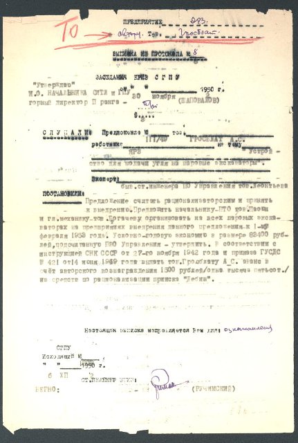 Документ. Выписка из протокола №8 заседания ВНЗ СПТУ от 30 ноября 1950 г. (о принятии рационализаторского предложения Гросблата А.С.). 30.11.1950