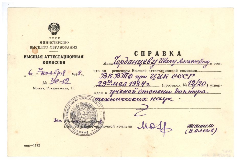 Документ. Справка № Ус-52 от 06.11.1948 г. на имя Черданцева И.А., об утверждении в ученой степени доктора технических наук. 1948