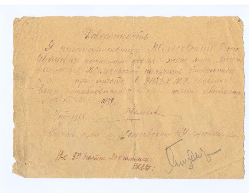 Документ. Доверенность от 11 августа 1938 г. на имя Железовской Любови Ефимовны на получение отобранных вещей. 11.08.1938