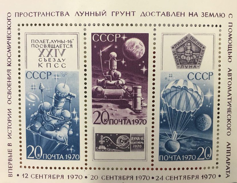 Блок почтовых марок, посвященный освоению Луны с помощью космических аппаратов Луны 16, полет которой посвящен XXIV съезду КПСС. 1970 г.