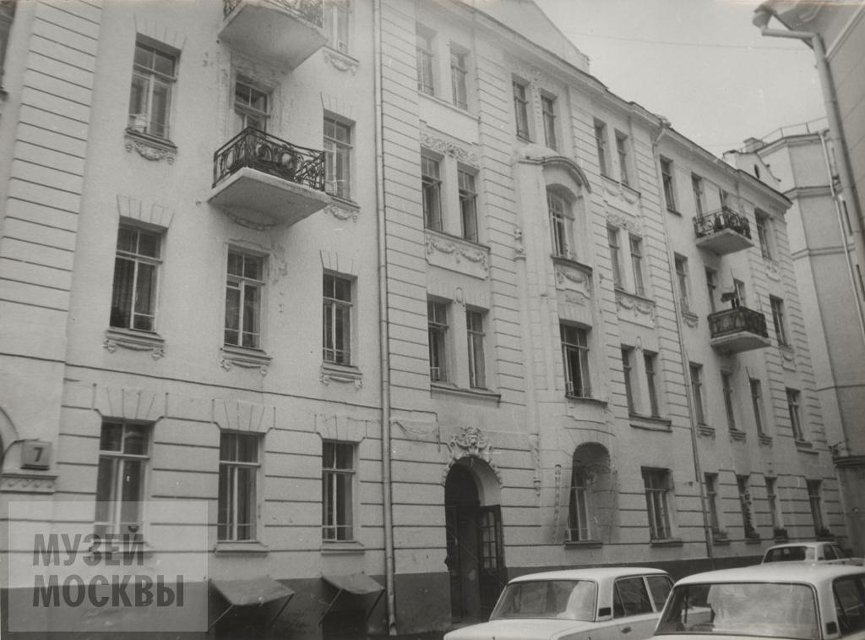 Фотография. Улица Веснина, д.7, корп.2. Вид на главный фасад здания. Июль 1987 г. Панков А.С.