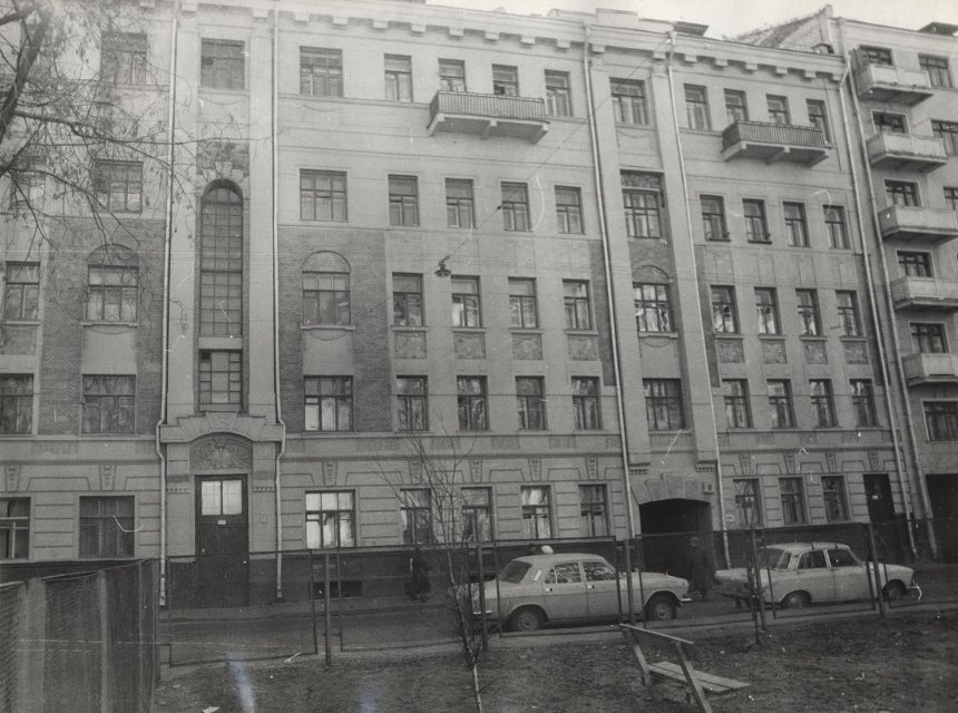 Фотография. Улица Медведева (сейчас Старопименовский переулок), д. 8. Вид на главный фасад здания. Май 1988 г. Панков А.С.