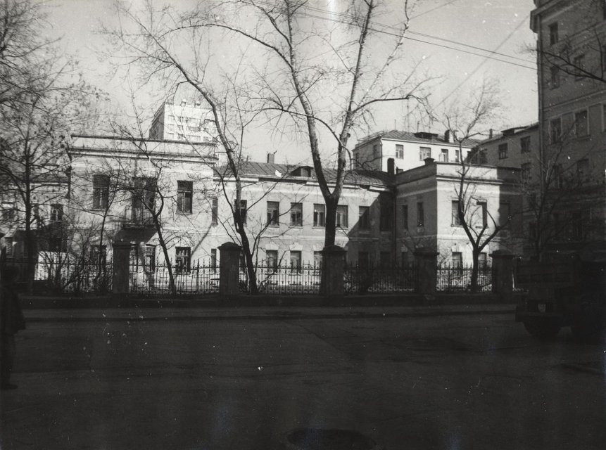 Фотография. Улица Медведева (сейчас Старопименовский переулок), д. 13, корп. 2. Вид на главный фасад здания за оградой. Май 1988 г. Панков А.С.