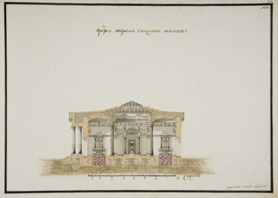 Чертеж. Поперечный разрез Египетского павильона Останкинского дворца. Вид на восток. Фиксационный чертеж. 1794-1795. Бизяев П.А.